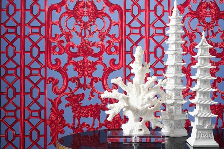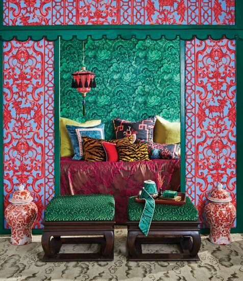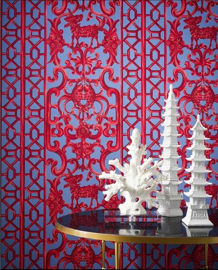 Duquette loved printed patterns with borders and was always cutting them out and sewing the borders together. Using them for chair skirts and curtains or gluing the borders throughout the room to add architectural interest. This Xanadu wallpaper design captures the pattern of the original carved openwork lacquer doors (with fish and dragons) in a panel print bordered on the sides by a classic fretwork frieze, in a color palette that ranges from soft to bold tones and a cobalt blue-coral red colorway.