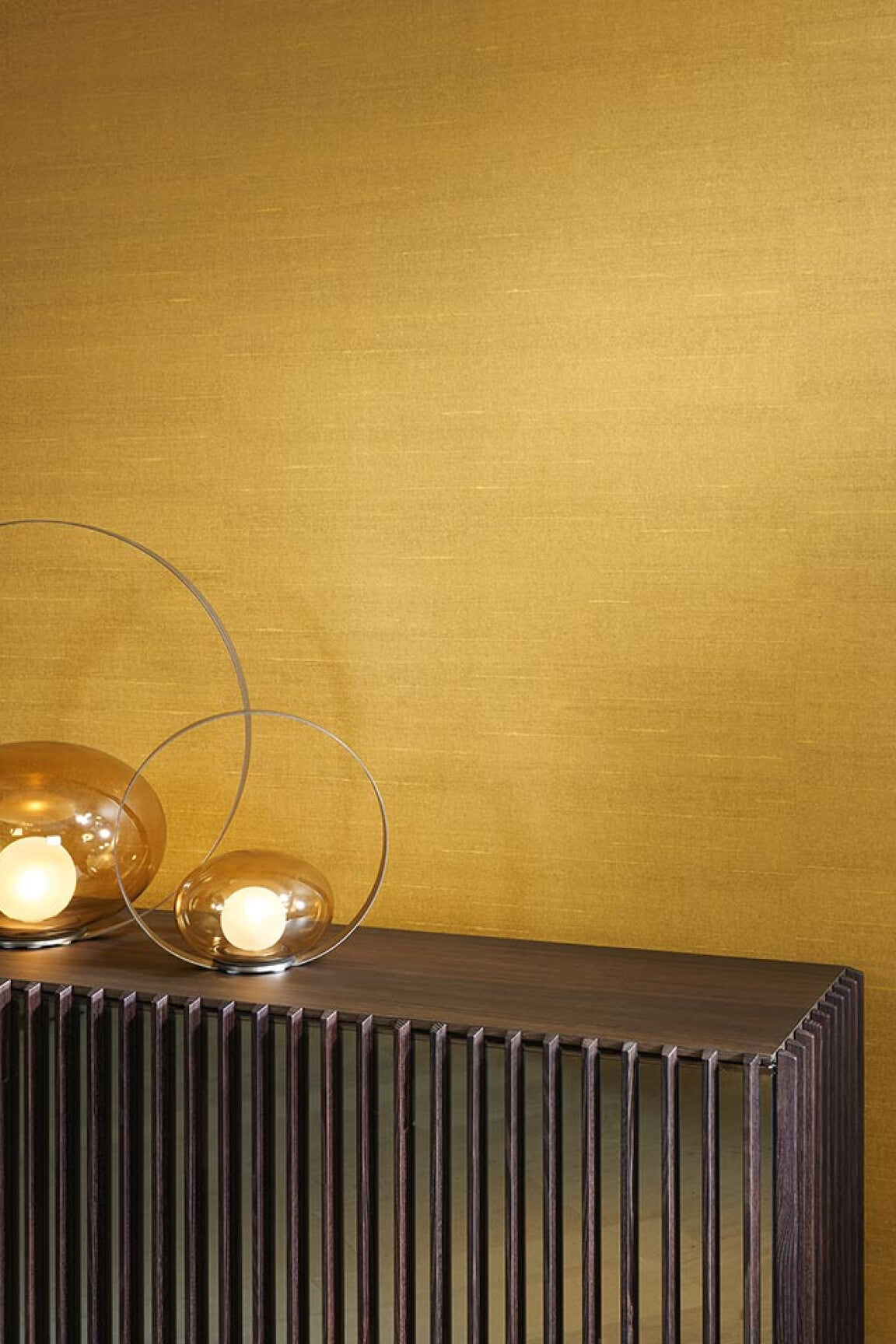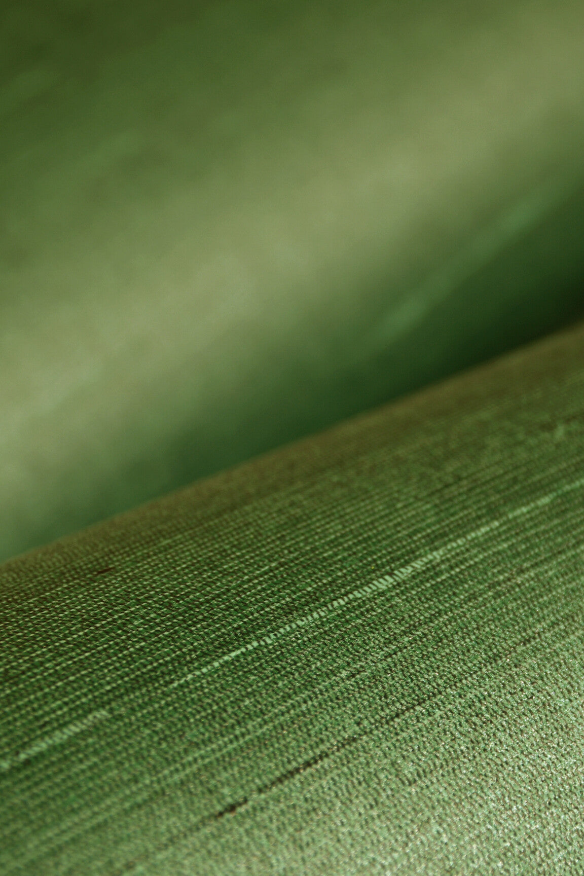 Een zijde-imitatie die perfect harmonieert met de andere referenties. Met de onregelmatigheden van natuurlijke zijde, met hier en daar een dikkere of ruwere draad en met de volle, intense kleuren van echte zijde. We kozen hier bewust voor een zijde-imitatie, gedrukt op non-woven, omdat dit kleurvast en veel duurzamer is.