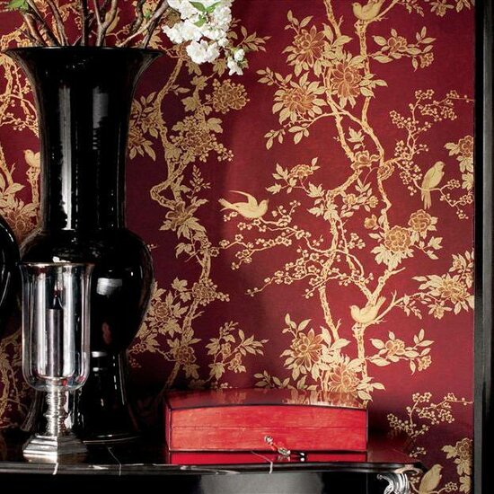 Zoals u kunt zien heeft dit Ralph Lauren Marlowe Floral behang een sierlijk aziatisch patroon van boomtakken en blad met vogels.