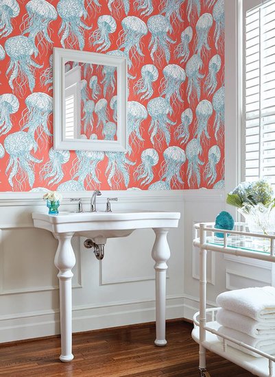 Jellyfish behang uit de Thibaut Summer House collectie heeft prachtige gestyleerde kwallen. Ideaal om toe te passen in bijvoorbeeld een badkamer of op het toilet. Het dessin uit de Thibaut Summer House collectie, dat nog meer zomerse behang patronen heeft, heeft een bijpassende stoffen collectie. Ideaal om mee te combineren.