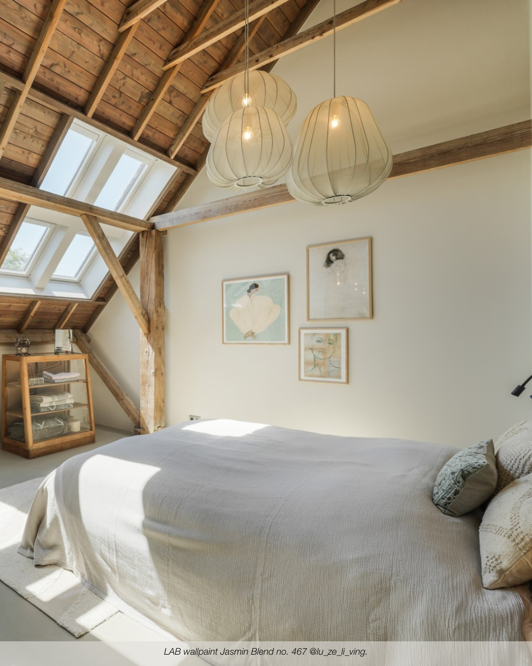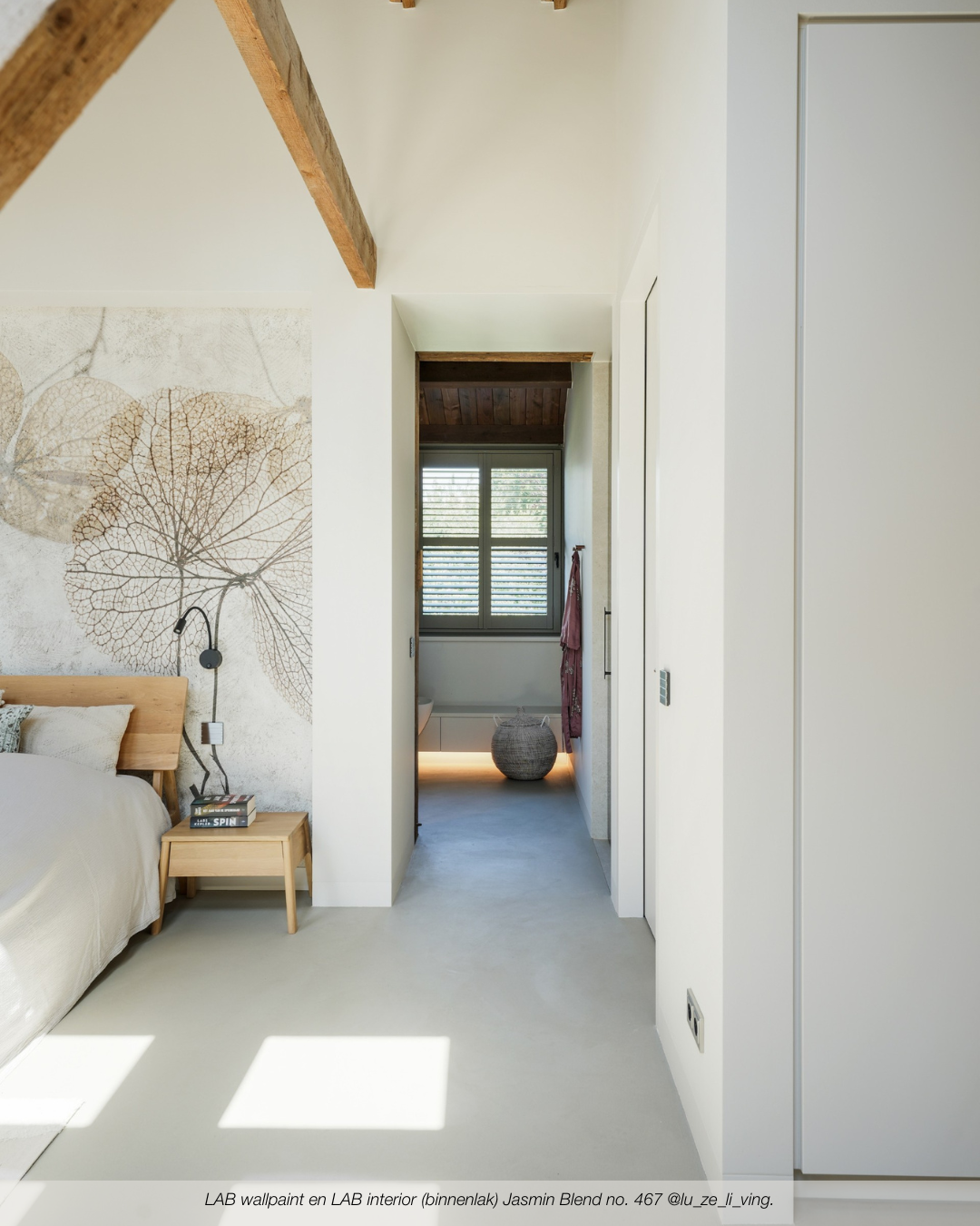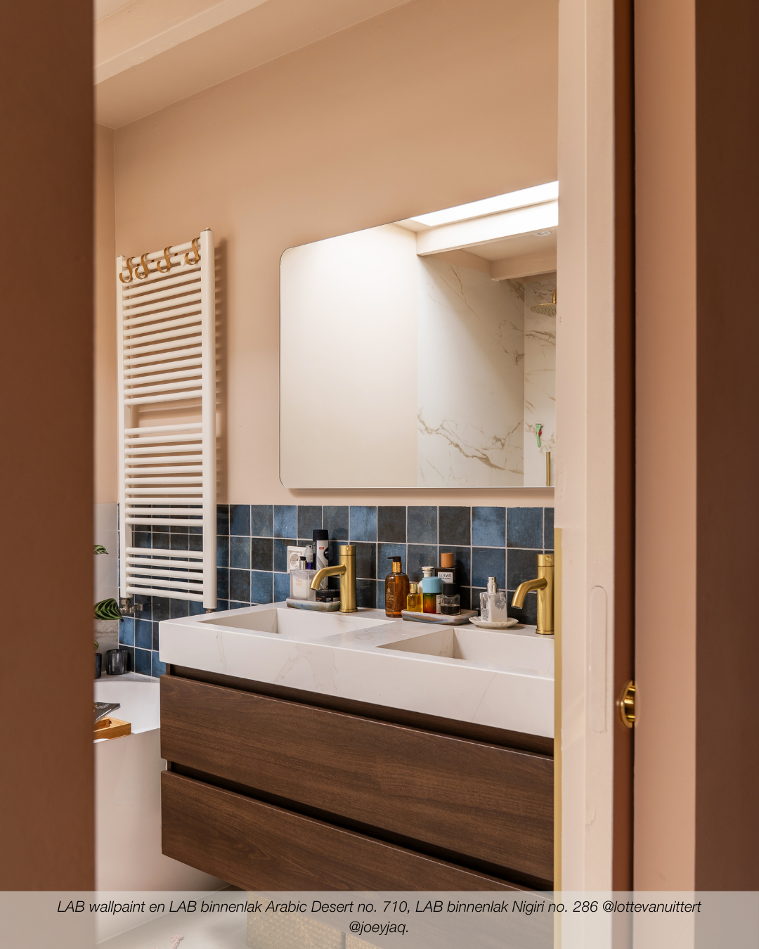 Zo kwam Femke vol overtuiging op White Truffle no. 644 voor de en-suite uit. “Deze kleur ligt mooi in het verlengde van Frosted Sand no. 374, maar is nét een tint donkerder. Dankzij de bruingrijze ondertoon geeft het de ruimte ontzettend veel sfeer. Precies waar we naar op zoek waren.”