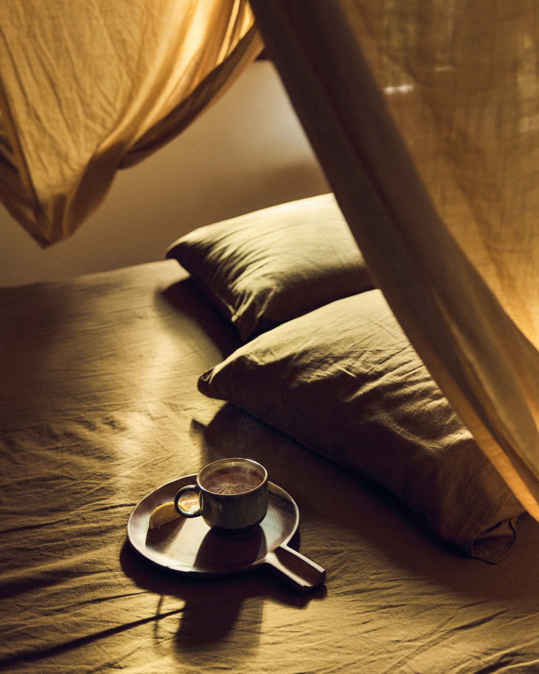 Om haar interieur, dat vooral bestaat uit rustige, neutrale kleuren, eigen te maken, voegt Femke persoonlijke details toe in de vorm van meubels en accessoires. “Ik speur graag de zolders van mijn familie af,” vertelt Femke. “Door antieke familiestukken te combineren met nieuwe items creëer je namelijk echt iets unieks. Daarnaast ben ik gek op kringloopwinkels en ben ik best goed in het vinden van bijzondere items. Ik maak voordat ik op pad ga altijd een lijst met wensen, zodat ik heel gericht kan zoeken.” Ze wijst ons op de Delfts blauwe vaas en de minimalistische zwarte kandelaar. “Mijn twee recente vondsten. Toen ik deze uit de stelling viste, kwamen er zelfs mensen naar mij toe om me te complimenteren, haha!”