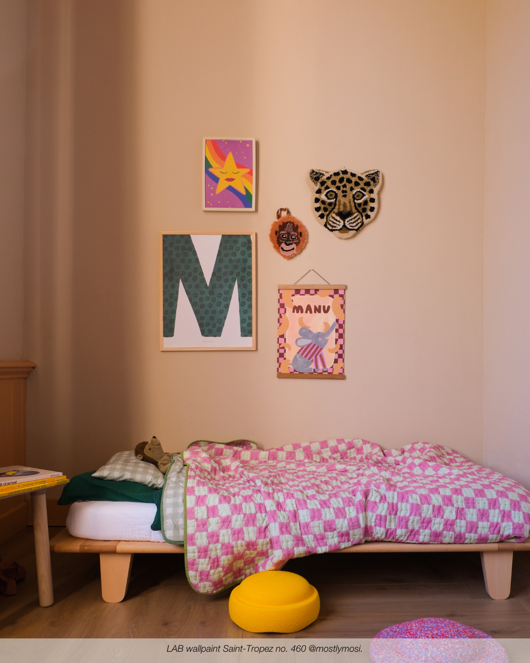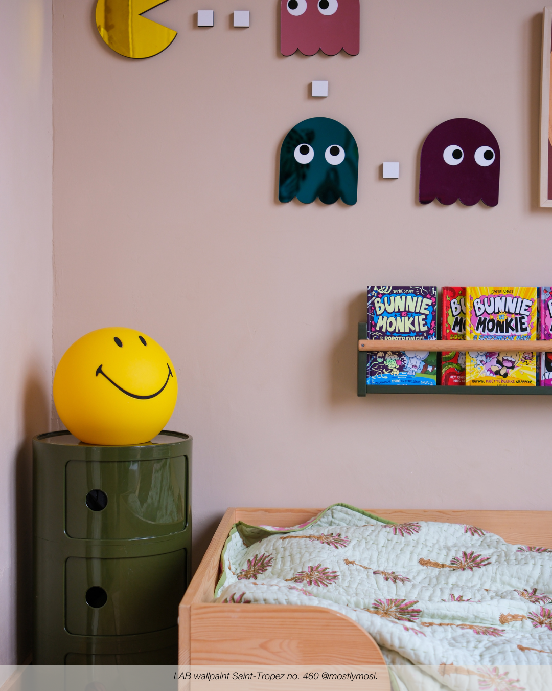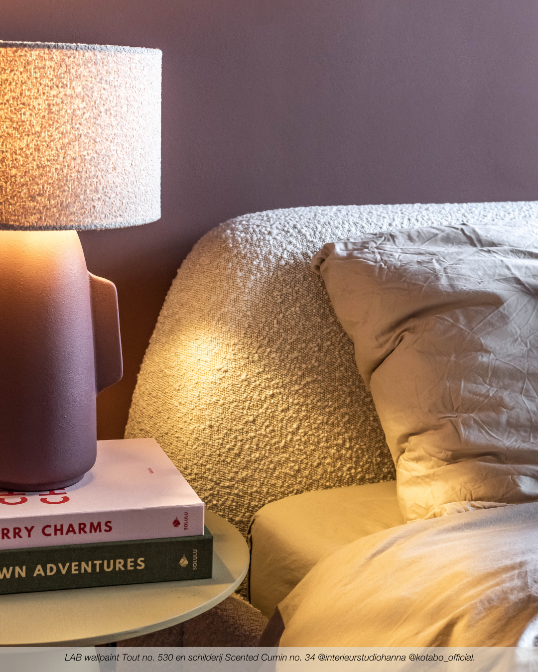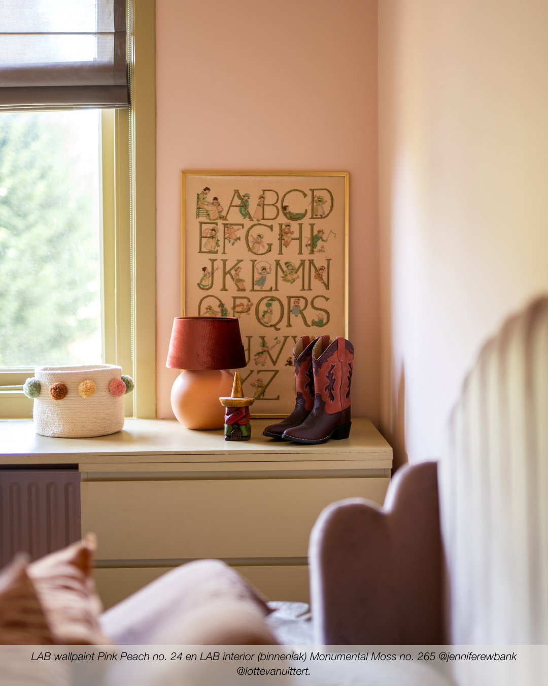 Om de burgundy-kleurige lamp extra te laten stralen, koos Femke voor Diamond Dust no. 232 als pop of colour in de kinderkamer. Ze schilderde zowel het bureau als de wandplank in de prachtige oudroze tint. Deze kleur geeft alledaagse items een opvallend accent en tilt de ruimte naar een hoger niveau. Bovendien combineert het perfect met het zachte, neutrale Frosted Sand no. 374, voor een harmonieuze en stijlvolle uitstraling.