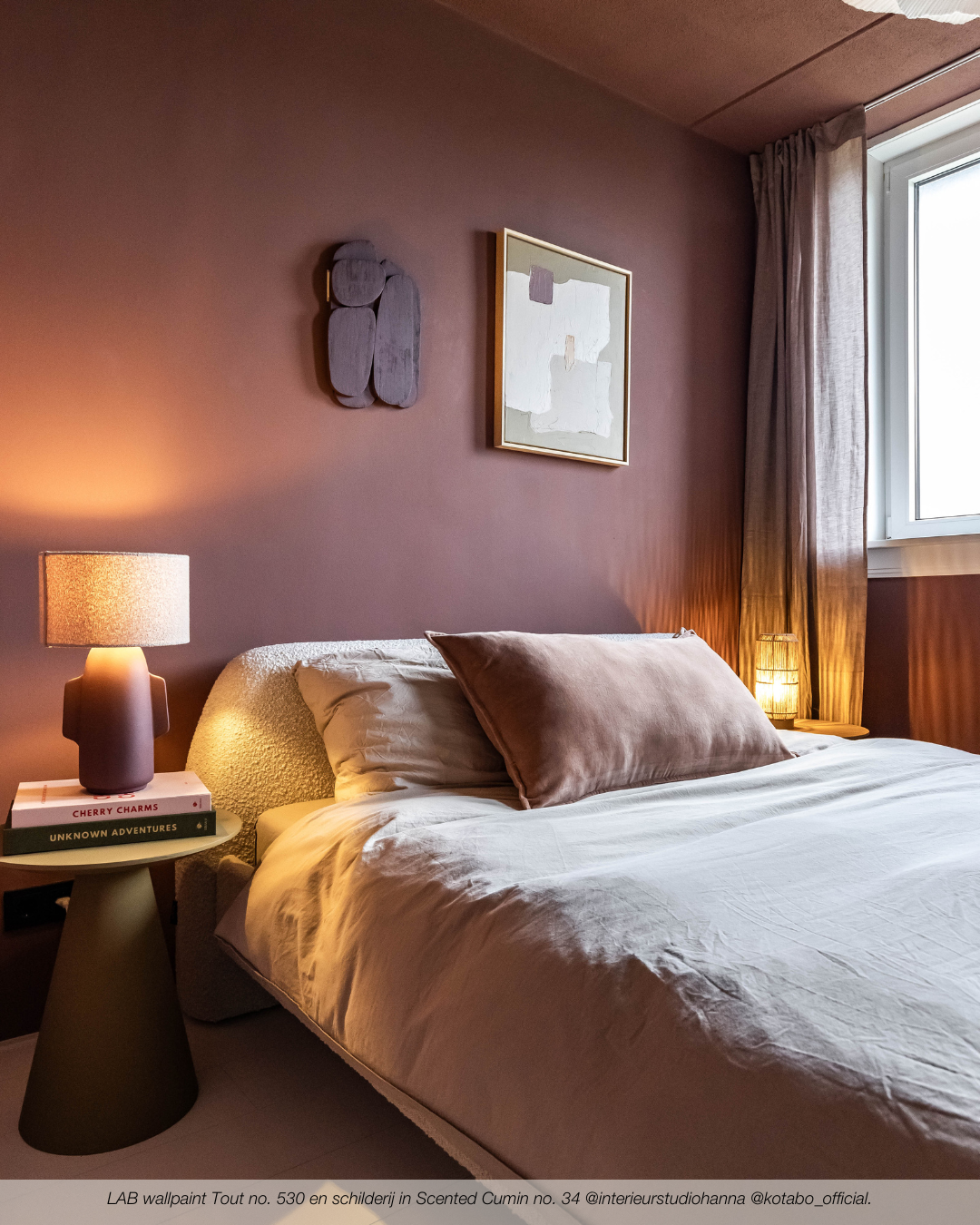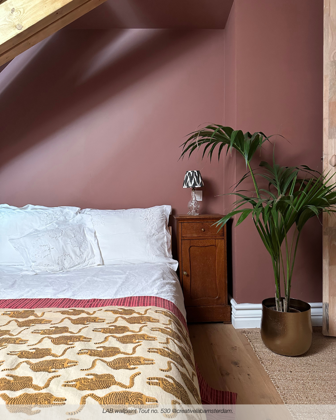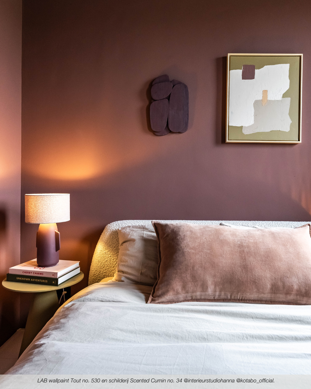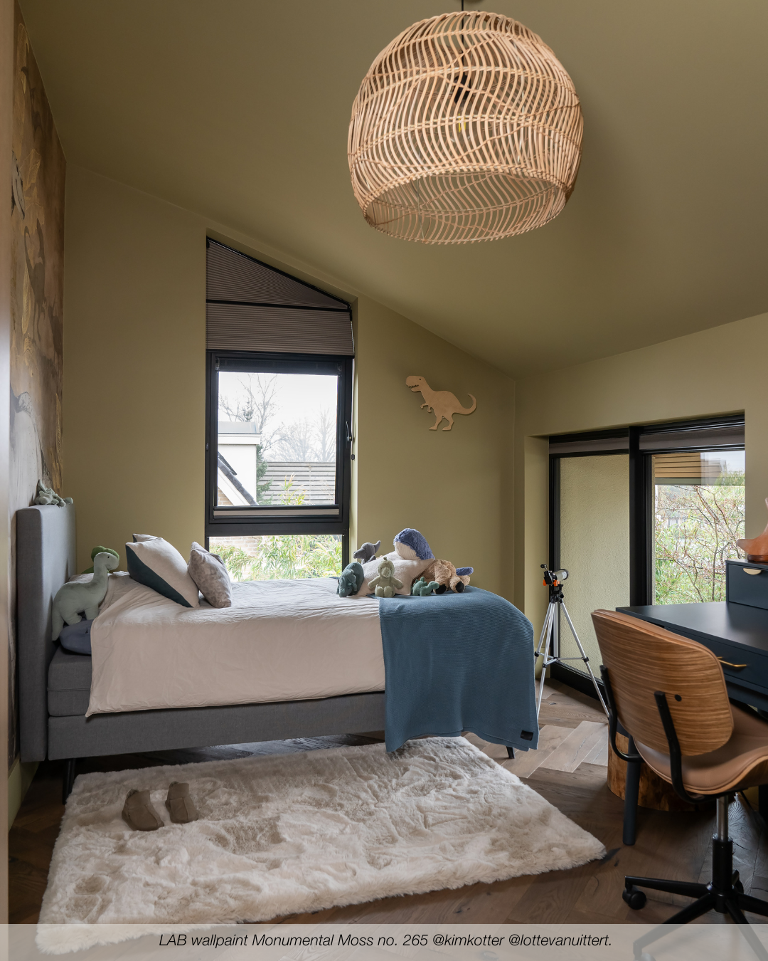 Om de burgundy-kleurige lamp extra te laten stralen, koos Femke voor Diamond Dust no. 232 als pop of colour in de kinderkamer. Ze schilderde zowel het bureau als de wandplank in de prachtige oudroze tint. Deze kleur geeft alledaagse items een opvallend accent en tilt de ruimte naar een hoger niveau. Bovendien combineert het perfect met het zachte, neutrale Frosted Sand no. 374, voor een harmonieuze en stijlvolle uitstraling.