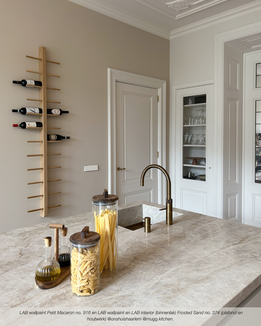 Ondanks dat Femke en Wouter geen hele drastische veranderingen wilden doorvoeren in hun interieur, mocht er in het nieuwe huis wel meer kleur terugkomen. “Onze vorige woning was heel strak en licht, met veel witte kleuren,” vertelt Femke. “Daar is op zich niks mis mee, want we houden van een rustig interieur, maar we misten wel warmte. We wisten dan ook zeker dat we in ons nieuwe huis meer kleur op de muren wilde toepassen.” De tint Frosted Sand no. 374, die bestaat uit een zacht samenspel van beige, grijs en crème, bleek de perfecte basis voor de muren en plafonds. “Het is een hele subtiele kleur, maar het verschil met onze vorige woning is enorm,” zegt Femke. “Dit zorgde meteen voor een knus gevoel.”
