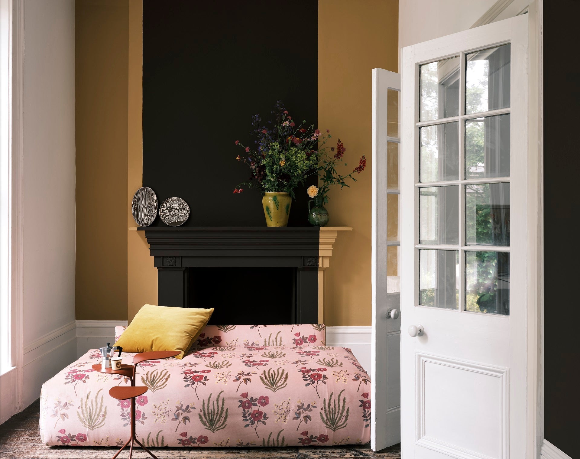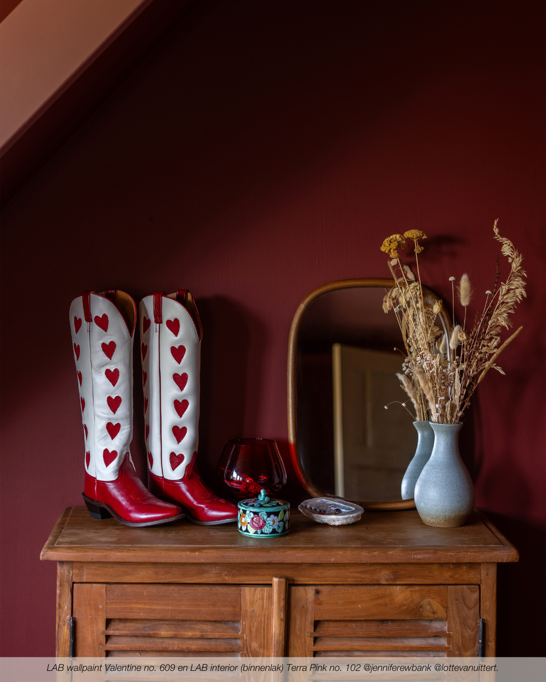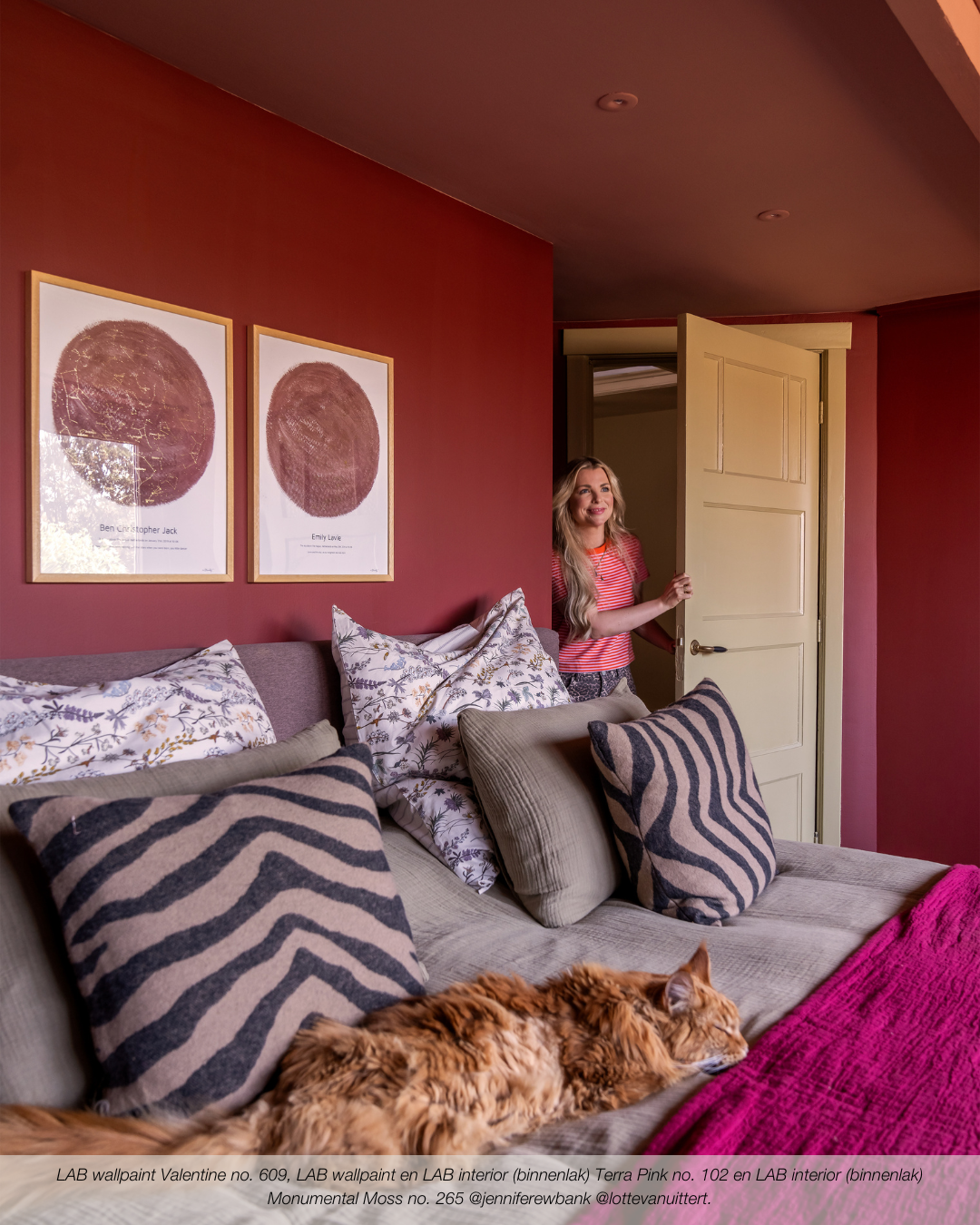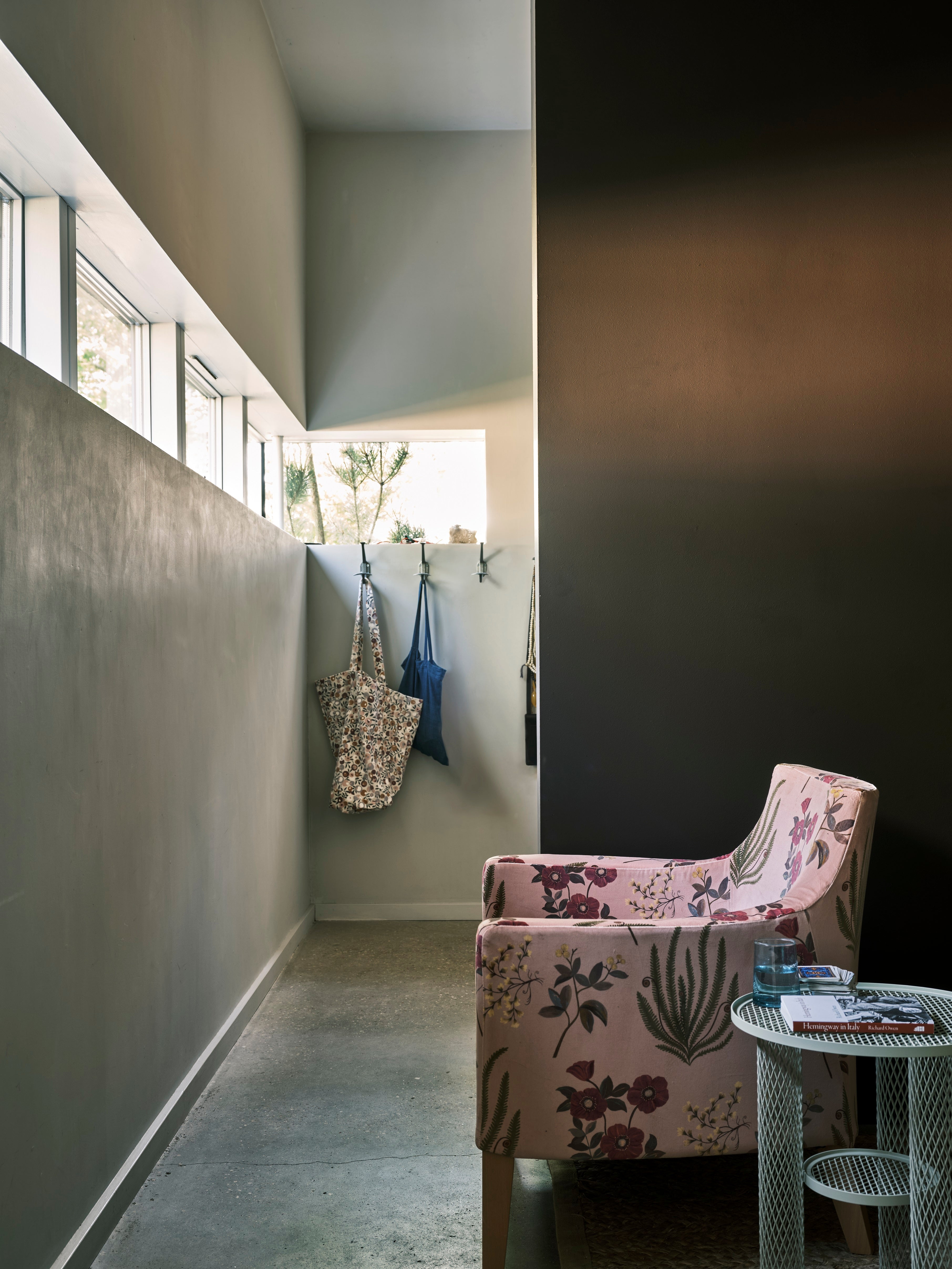 Wat betreft inspiratie voor het kleurenpalet, verwijst Maartje naar een favoriete reisbestemming van haar en Dirk: de Cotswolds in Engeland. Liefst gaan ze er elk jaar naartoe. 'Een beetje dat Arts and Crafts-gevoel. Ouderwets behang en vergrijsde kleuren, zoals LAB die ook heeft,' mijmert Maartje. 'Ik val enorm op die net-niet-kleuren, die off-tinten van de Cotwolds. Er stroomt bij die Britten een smaakgevoel door de aderen dat al het tuttige en klassieke toch steeds een vleugje van nu geeft. Dat zie je in de Cotswolds in elke pub. Ze zijn hip zonder hip te willen zijn. Ik begon voor dit huis eigenlijk met een strakke mid-century visie, daar ben ik namelijk óók gek op. Maar ik liet me toch ook steeds verleiden door dingen die ik gezellig vind, door dat Engelse van de Cotswolds dus. Wat mij betreft mag dat nog wel wat meer in dit huis komen. Maar een interieur moet ook een beetje groeien, het kan niet meteen klaar zijn.'