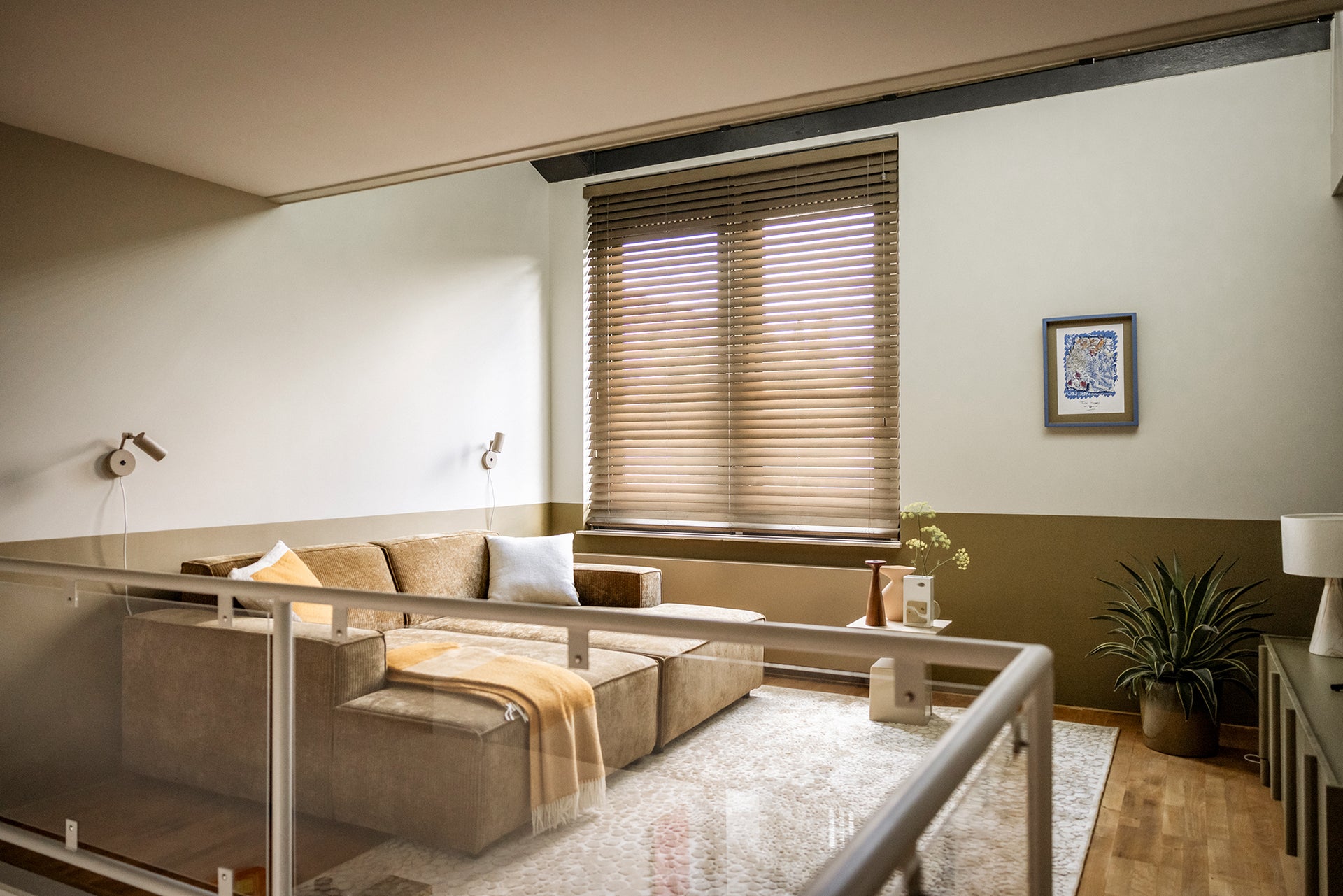 De vide was tot nu toe een ruimte die weinig werd gebruikt door de bewoners. Om deze plek nieuw leven in te blazen, is ervoor gekozen er een tv-kamer van te maken. De kleur Scented Cumin no. 34, die tot net boven de bank komt, zorgt daarbij voor een ruimtelijk gevoel en een warm, krachtig statement.