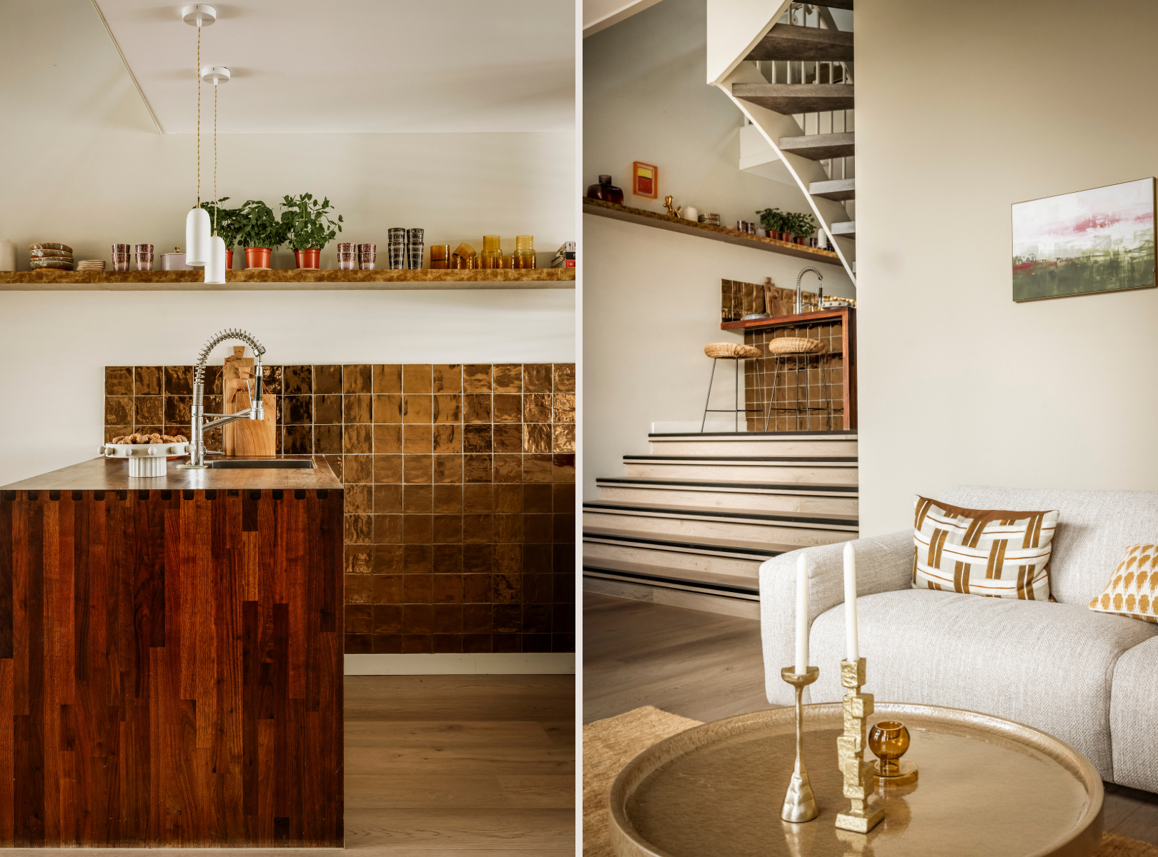 Door de keuken te wrappen in een warme tint, passend bij de basiskleur Cotton Cloud no. 223 en het bestaande houten werkblad, ontstaat er een harmonieus geheel. Een gouden tegeltje als speelse toevoeging verwijst naar het moodboard van Diaan, waarin haar guilty pleasure – glitter en glamour – subtiel terugkomt.