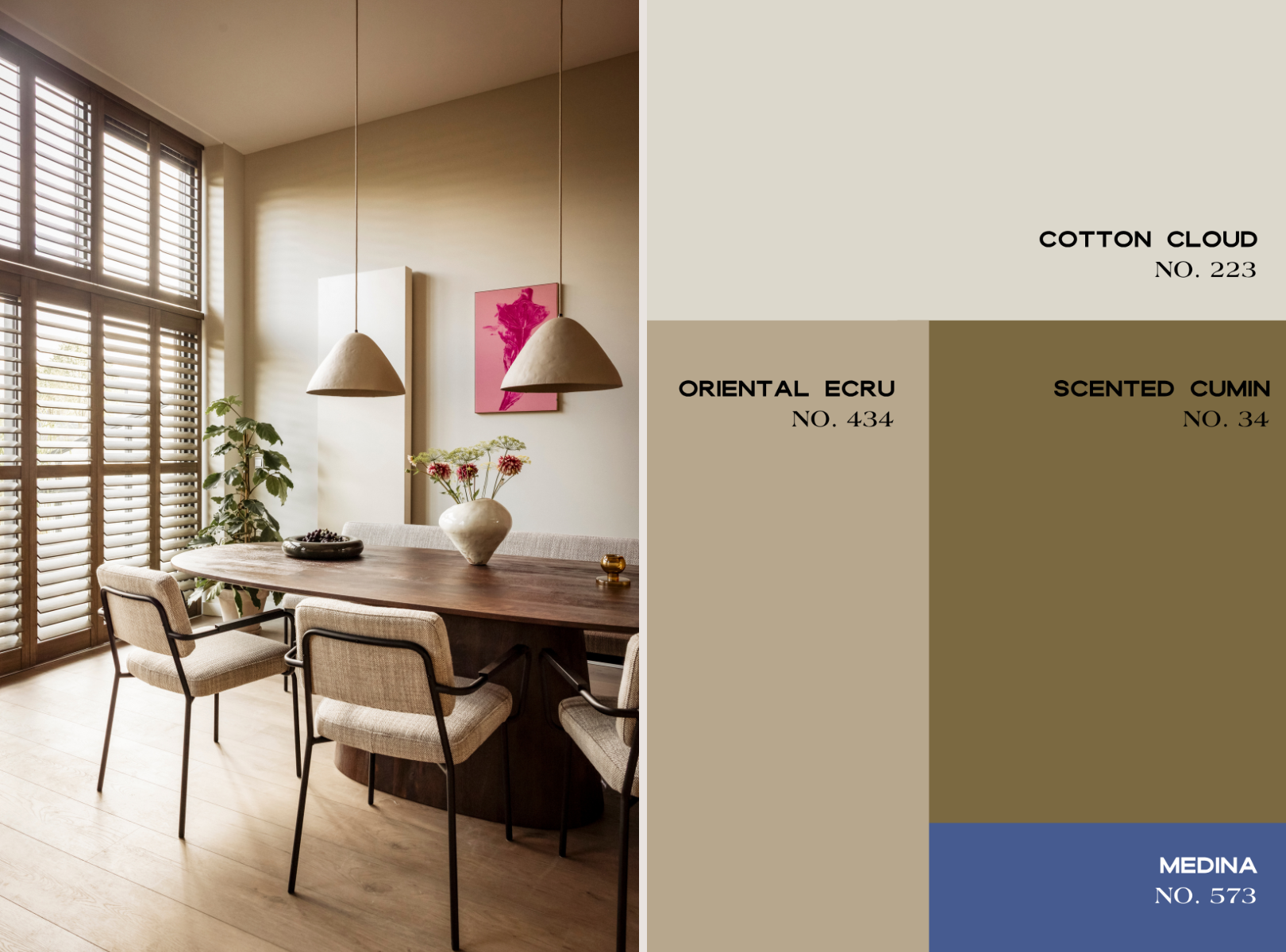 Samen met Oriental Ecru no. 434, Scented Cumin no. 34 en de accentkleur Medina no. 573, wordt het geheel een warm en krachtig palet.