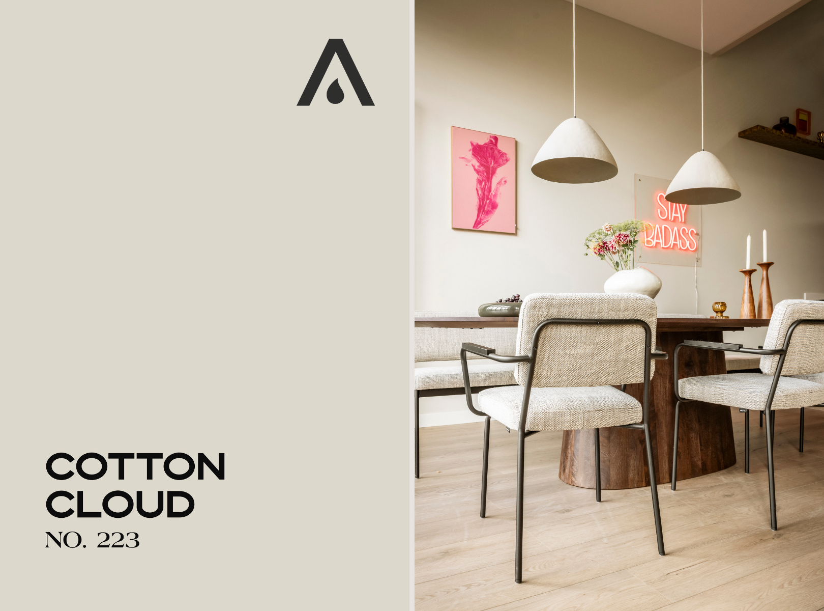 De basiskleur Cotton Cloud no. 223 zorgt voor een rustig geheel in zowel de keuken als de eethoek. Deze warme wittint verzacht de ruimte en laat zich moeiteloos combineren met andere kleuren. Hier krijgt hij extra warmte dankzij de zachte stoffen en natuurlijke materialen – precies de finishing touch die het huis nodig had.