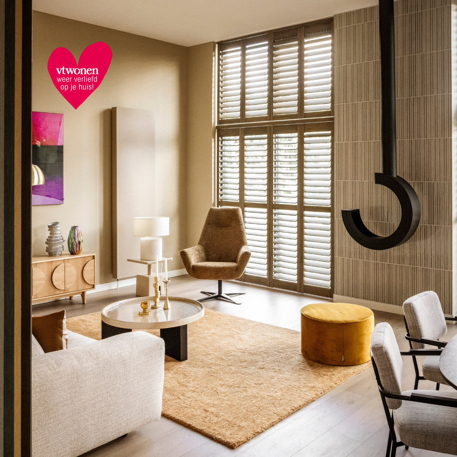 Het witte huis van Diaan en Carlo is omgetoverd tot een warm geheel met een gouden ondertoon. Stevig urban, zoals stylist Fietje het noemt. Als basis is gekozen voor Cotton Cloud no. 233, een kleur die de boven- en benedenruimte met elkaar verbindt.