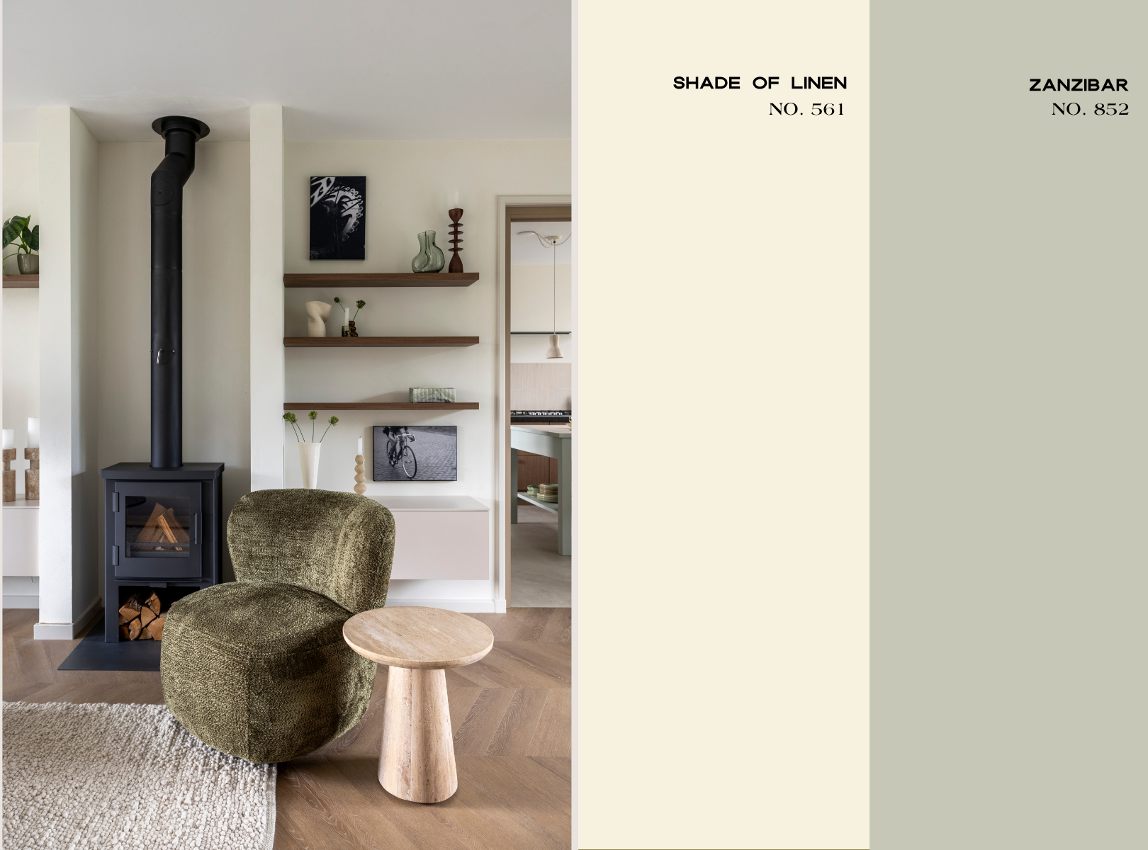 Ze werkt met een verfijnd palet waarin de rustige LAB kleur Shade of Linen no 561 de basis vormt. Deze wordt gecombineerd met het zachte, natuurlijke groen van Zanzibar no. 852 wat samen zorgt voor een serene uitstraling.