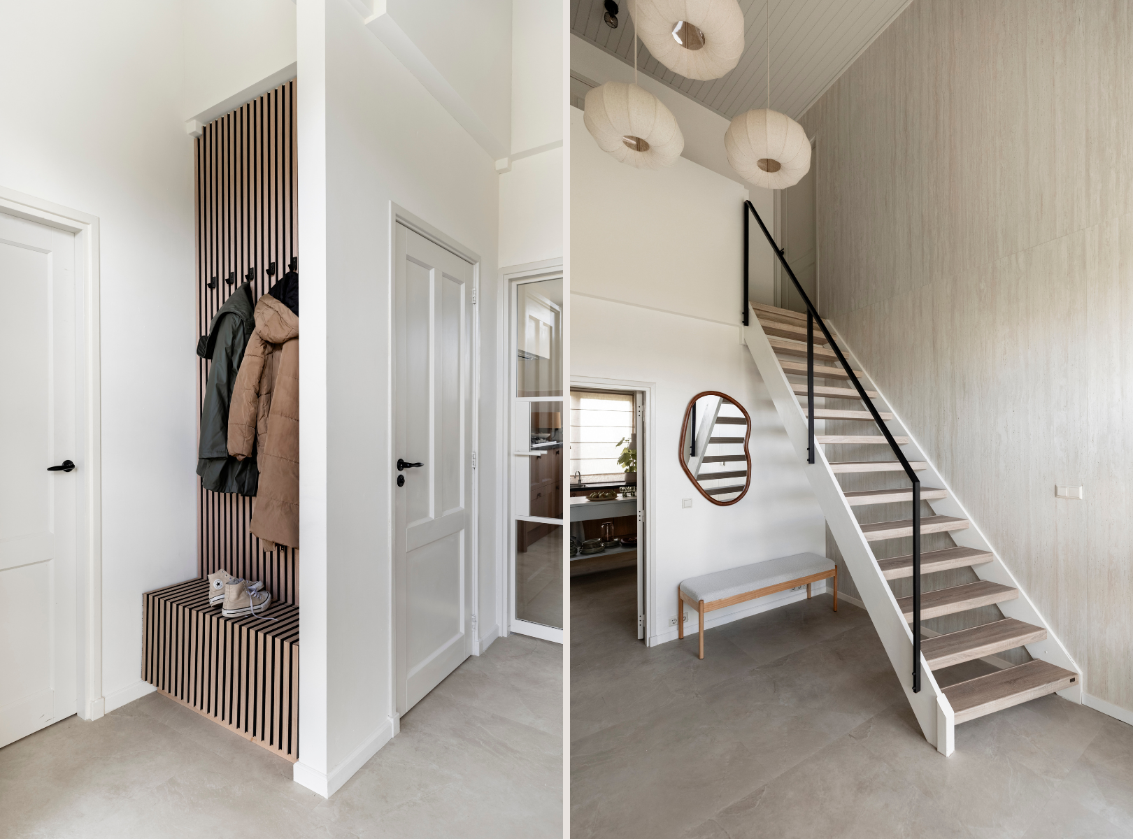 Het was een doorn in het oog van de bewoners: de hal. De trap en de ouderwetse, ongestucte wanden zorgden voor een rommelig aanzicht, en gaven geen goede eerste indruk van de woning. Dat is nu compleet anders. Met een nieuwe trap en een wand in travertinlook heeft de entree een lichte, warme en rustige uitstraling gekregen.
