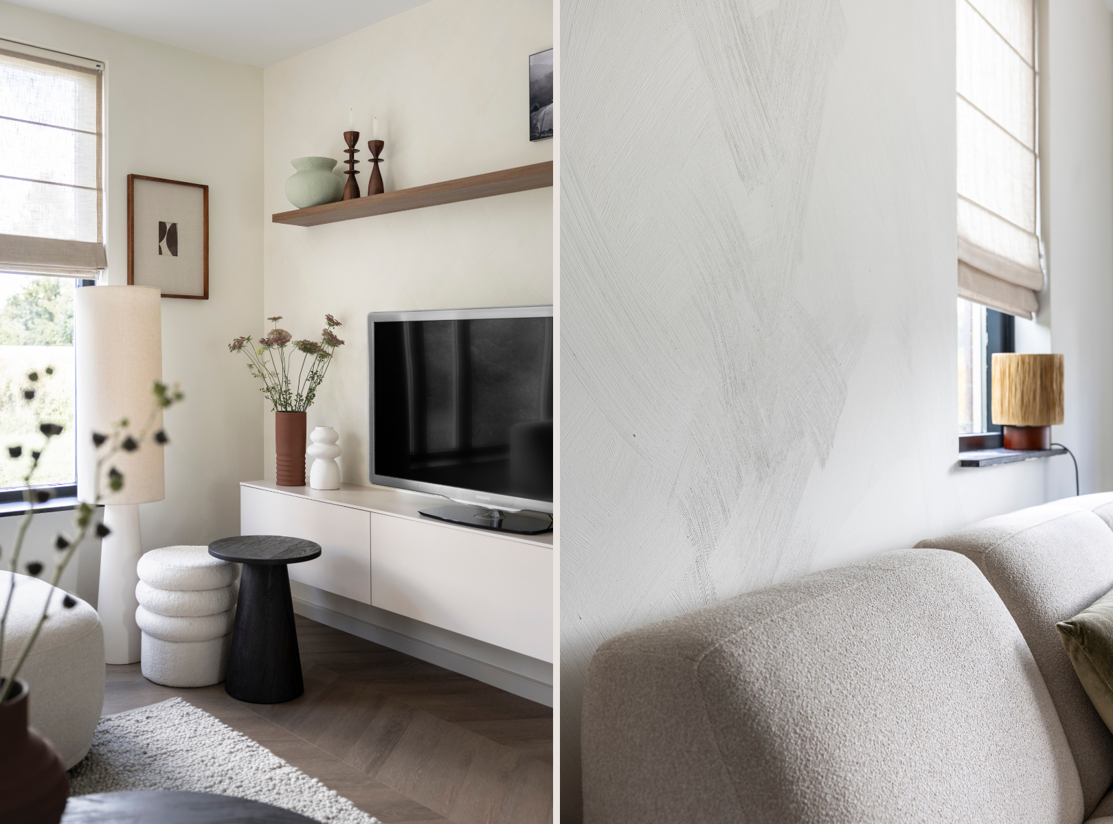 De vrijstaande woning ademt rust dankzij een lichte basis in Shade of Linen no. 561. De wand achter de bank is afgewerkt met LAB chalk, een kalkverf die met haar poederachtige textuur, zachte schakeringen en matte glans warmte en karakter toevoegt. Door de verf op verschillende manieren aan te brengen, ontstaat een uniek en levendig effect.
