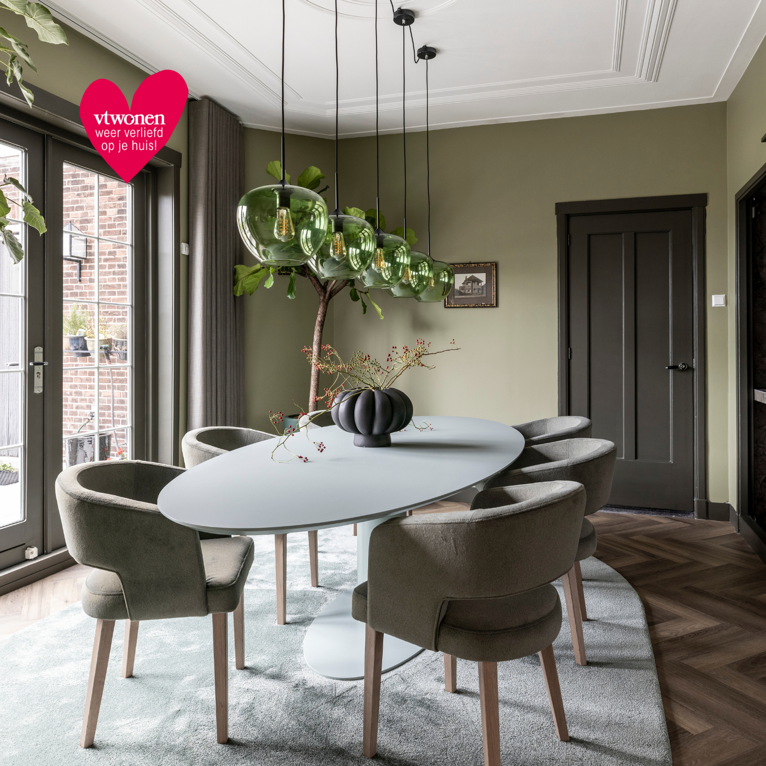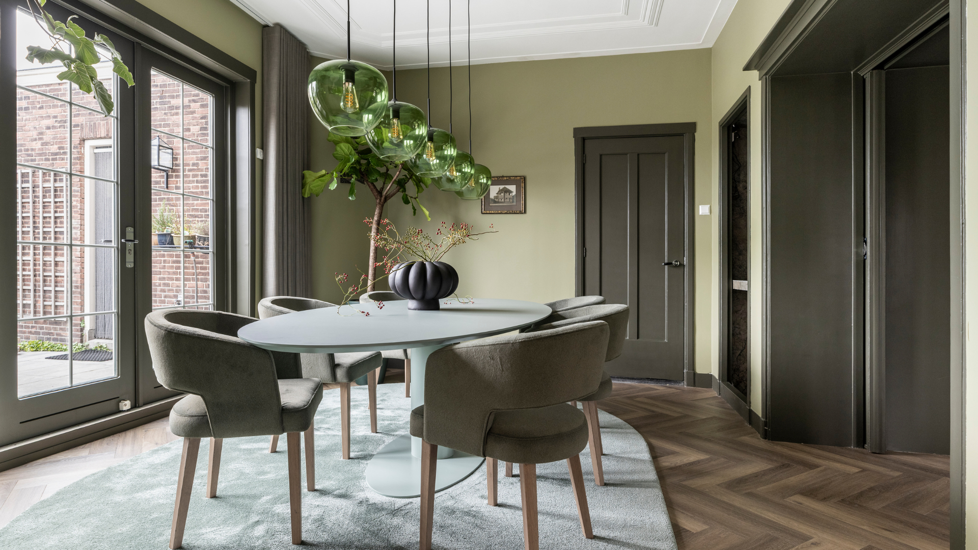 De wanden in de eetkamer en serre krijgen de zachtgroene LAB kleur Moss no. 41. Dit mosgroen creëert direct een oase van rust – precies waar Debbie naar verlangt. Dankzij de subtiele gele ondertoon laat de kleur zich moeiteloos combineren met andere warme kleuren, vooral met geeltinten.