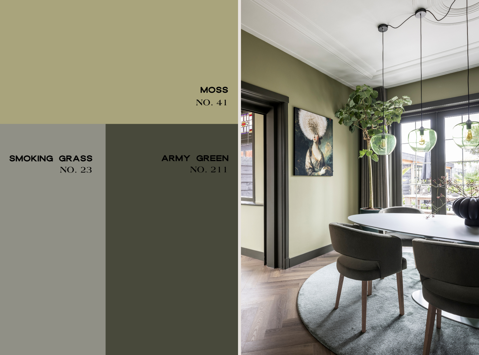 Het groene palet bestaat uit de LAB kleuren Moss no. 41, Army Green no. 211 en Smoking Grass no. 23.