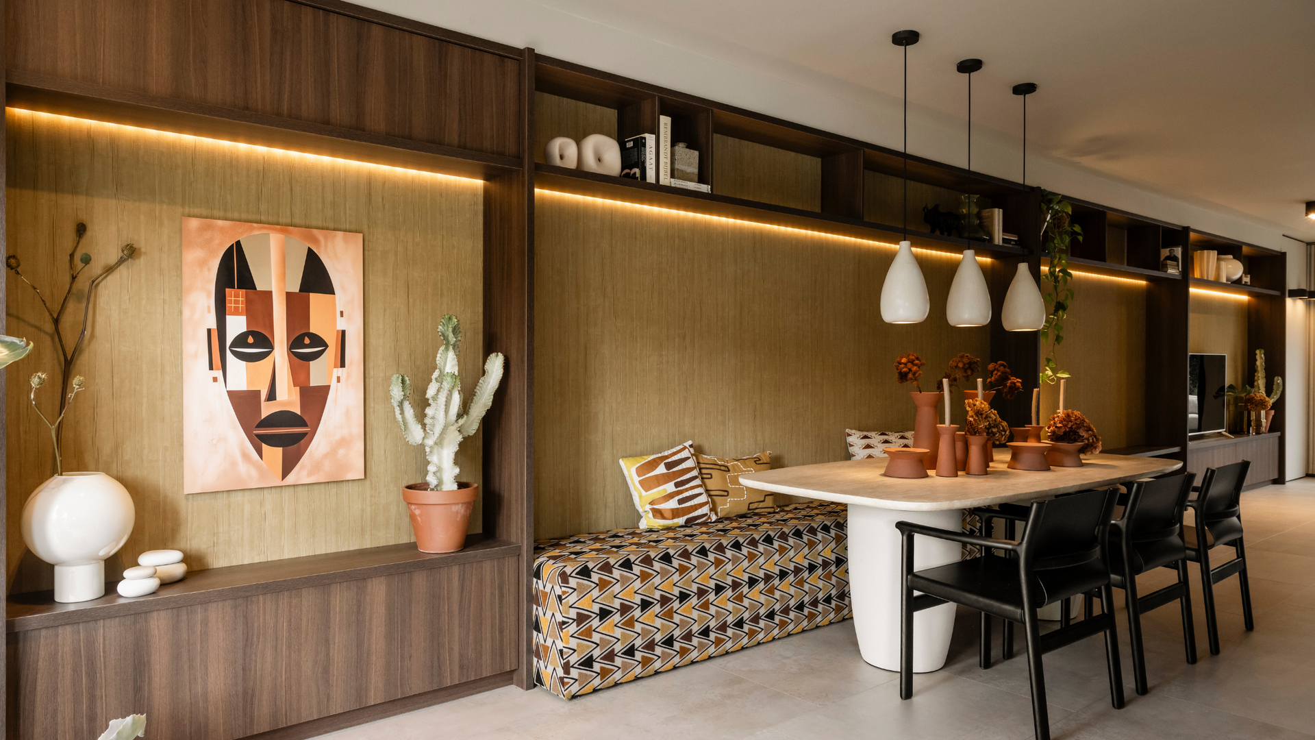 Met linnen, hout, rijke prints en behang brengt ze een Afrikaans geïnspireerde sfeer tot leven. De basis is rustig en beige, maar krijgt diepte door donkere tegels, donkergroen behang en warm hout.