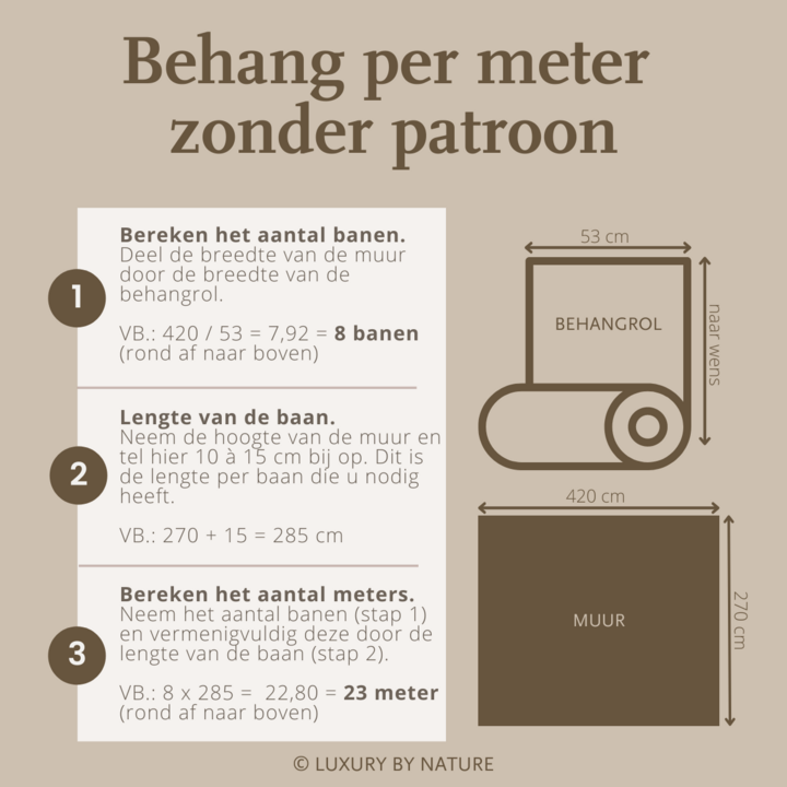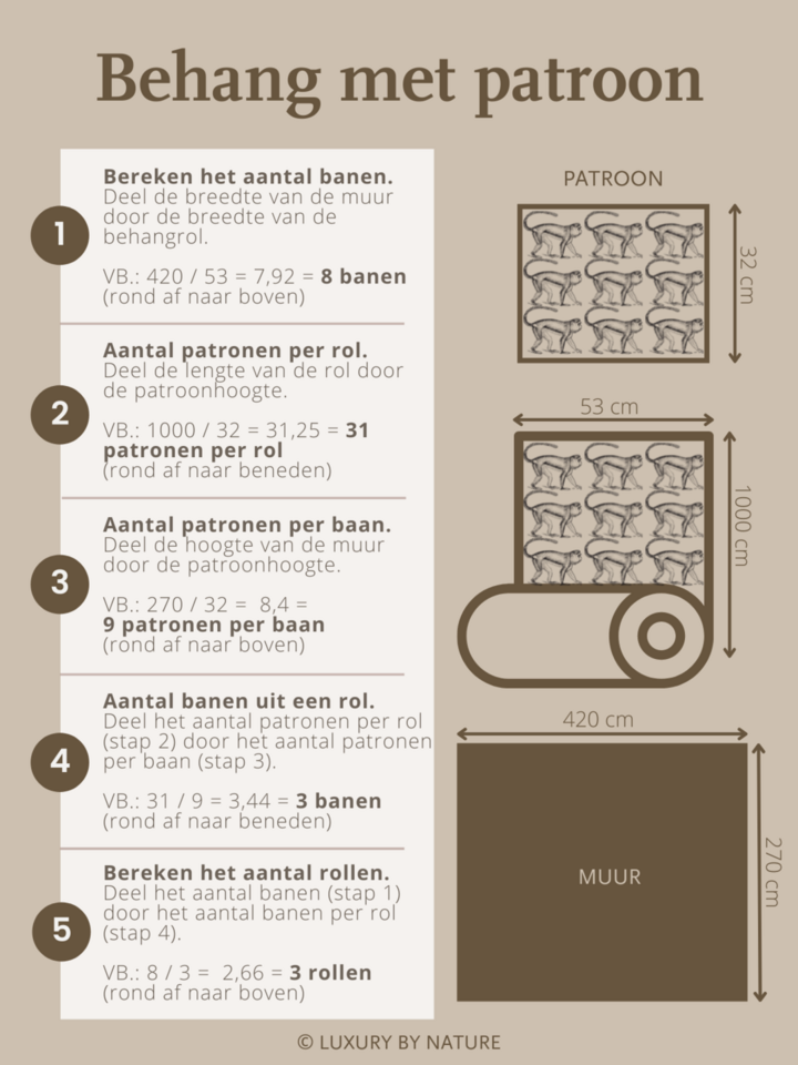 Nutzen Sie dann die untenstehenden Rechenbeispiele, mit denen wir auf einfache Weise erklären, wie Sie berechnen können, wie viele Rollen Sie benötigen. Oder senden Sie eine E-Mail mit den Maßen der Wand und der Tapete an support@luxurybynature.nlTapete berechnen ohne Muster