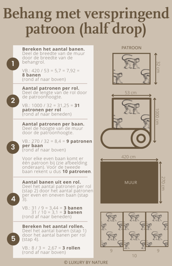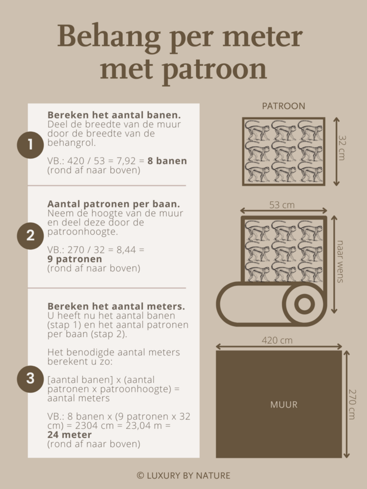 Wir helfen Ihnen gerne bei der Berechnung, wie viele Tapetenrollen Sie benötigen. Sie können hierfür eine E-Mail senden an isupport@luxurybynature.nl. Lassen Sie uns wissen um welche Tapete es geht um die Höhe der Mauer und die gesamte Breite der Oberfläche. Telefonisch weitergeben und berechnen ist - um Missverständnisse zu vermeiden - leider nicht möglich.
