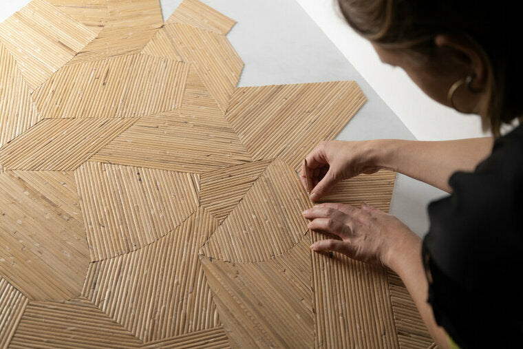 Die Mauna-Tapete von Arte ist ein wahres Meisterwerk. Oder ist das Wort Kunstwerk vielleicht noch passender? Kleine Rattanstücke werden sorgfältig von Hand in ein verspieltes und scheinbar zufälliges Muster eingelegt.