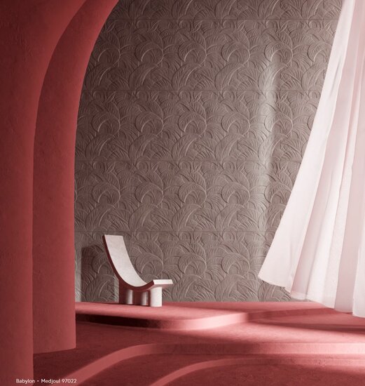 Die ARTE Medjoul-Tapete hat aufgrund der verwendeten Technik und des voluminösen Materials ein fliesenförmiges Design mit viel Relief. Das Muster ist von Dattelpalmen inspiriert, einer im Nahen Osten verbreiteten Pflanze.