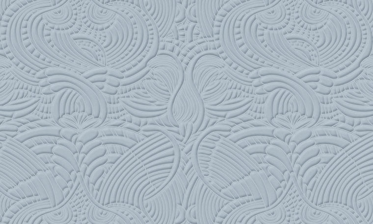 3D-Wandverkleidung in der Optik von weichem Wildleder, inspiriert vom natürlichen Outfit des Dodo Pavone – ein weicher Federbusch aus silberfarbenen Federn in verschiedenen Grau-, Blau-, Beige- und Weißtönen.