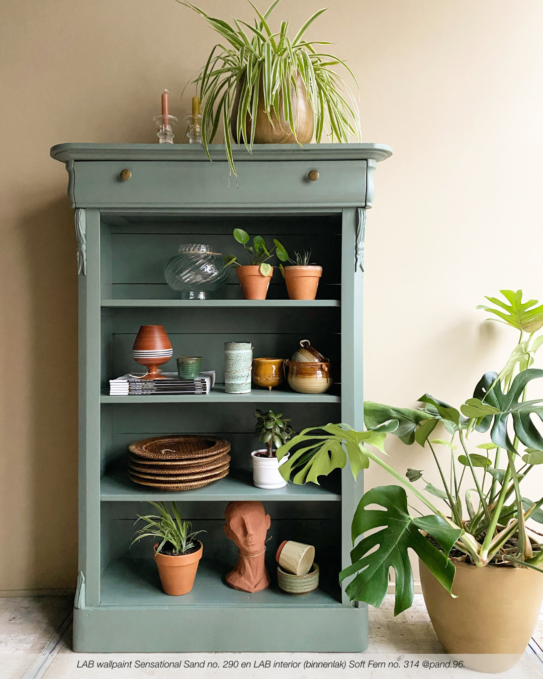 3. LAB chalk 2: Breng 2 lagen kalkverf aan, afhankelijk van het gewenste effect. Werk met een blokkwast, spons of doek. Gebruik een mengbeker om de verf met water te verdunnen en egaal te mengen.