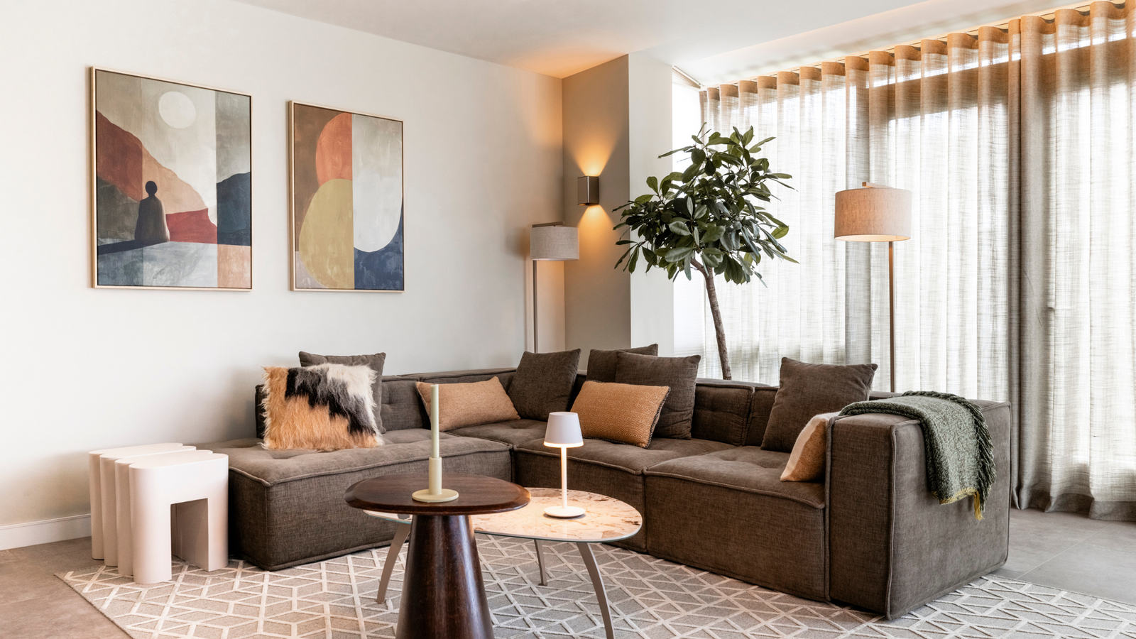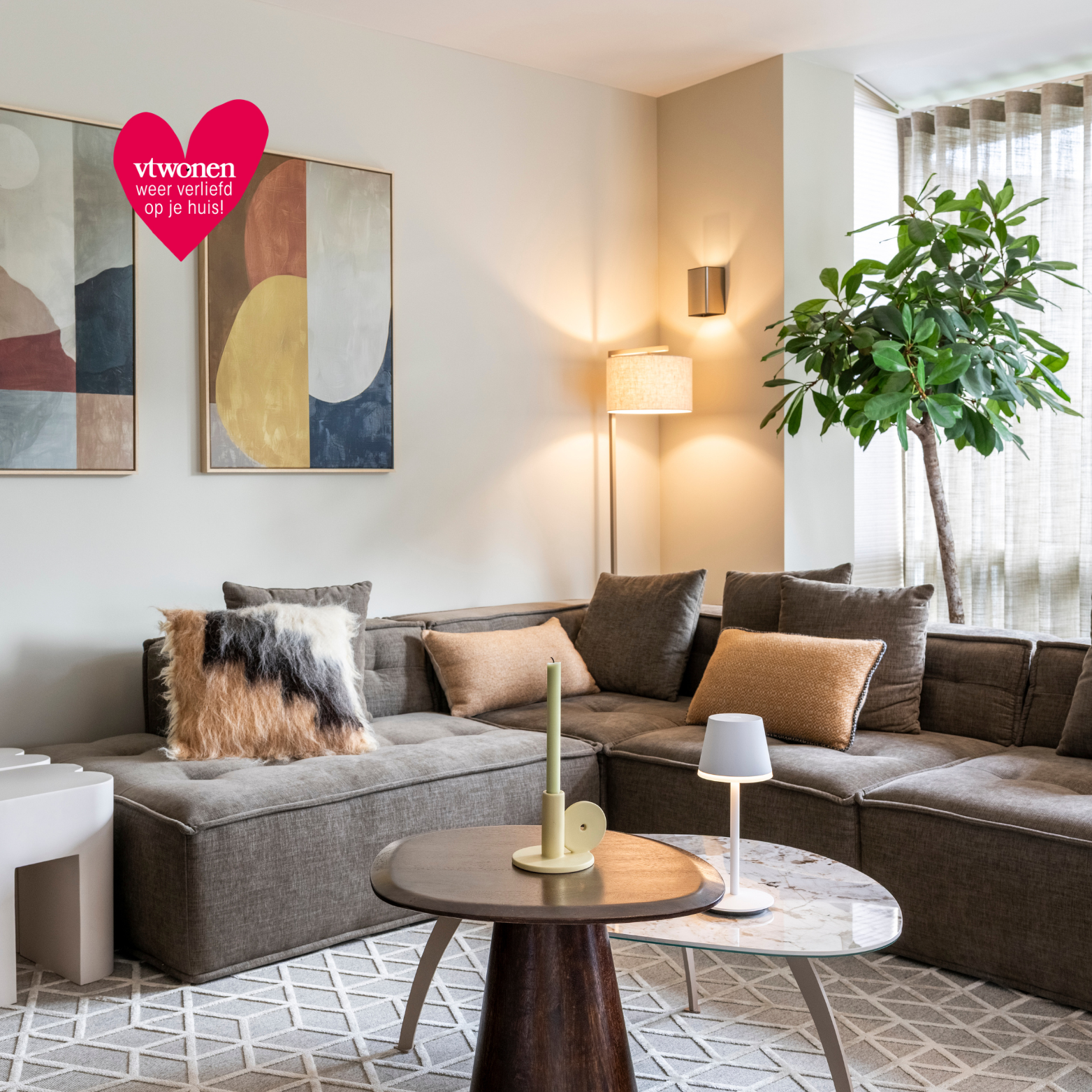 Stylist Fietje maakt de woning persoonlijker en warmer door aaibare stoffen, rijke structuren en LAB-kleuren te gebruiken. De make-over omschrijft ze als 'functioneel romantisch'.