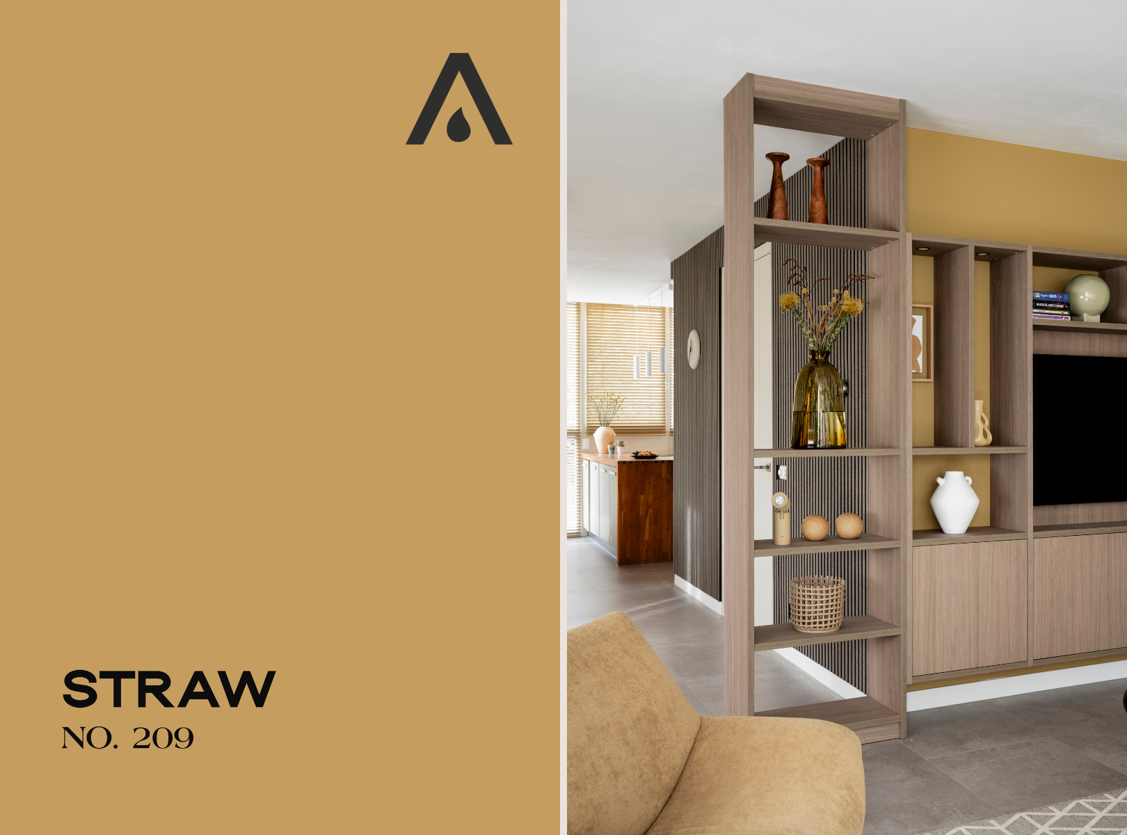 Een geel accent in de woning? Straw no. 209 is hier de perfecte keuze. Deze kleur verbindt mooi de moodboards van beide bewoners, waarin geel bij allebei terugkomt. De mix van oker- en mosterdgeel straalt energie uit en brengt een vleugje vrolijkheid in het interieur. Het is een ideale accentkleur binnen het palet en geeft de woning meer levendigheid en persoonlijkheid.
