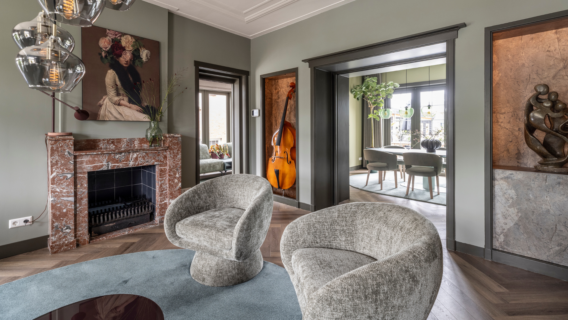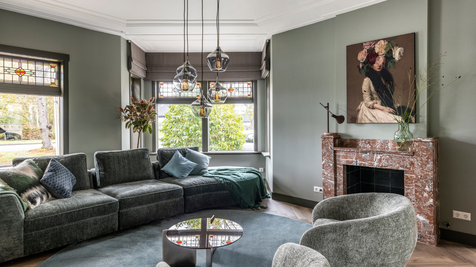 Groen blijft de basis van het palet, maar in de woonkamer maakt blauw een subtiele entree.