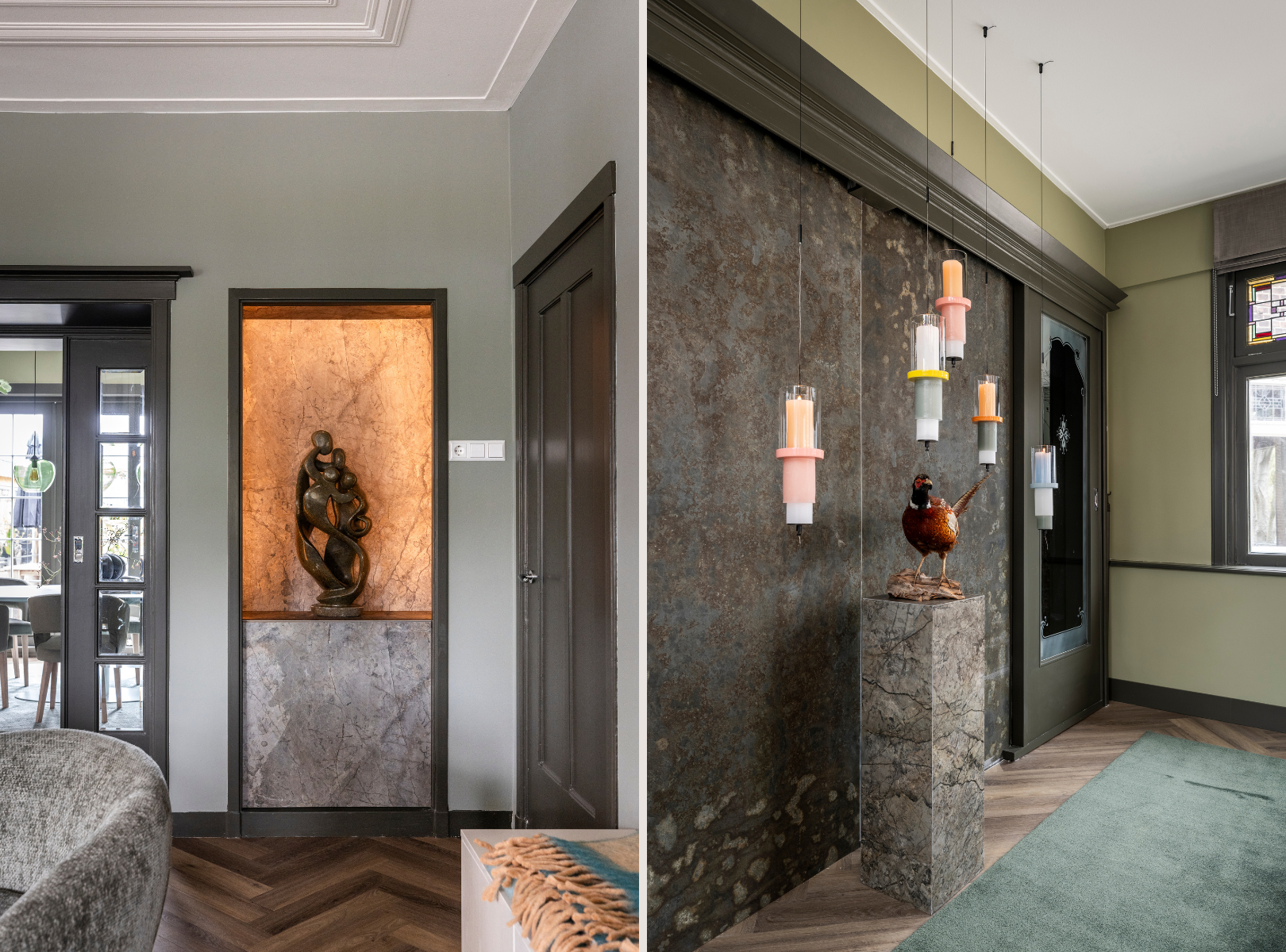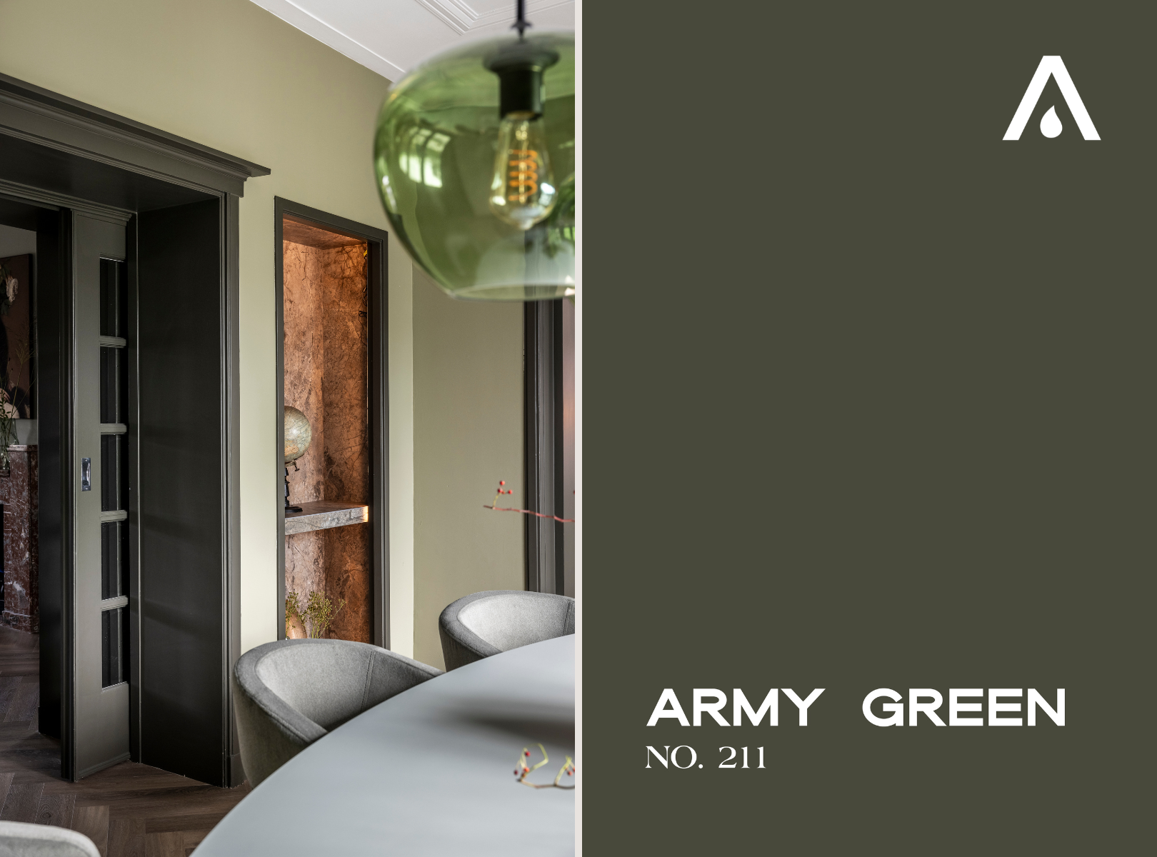 De kozijnen worden allemaal geschilderd in Army Green no. 211. Deze intense, donkergroene LAB kleur is perfect voor een krachtig statement. In combinatie met Moss no. 41 ontstaat er een ton-sur-ton effect dat rust en luxe uitstraalt. Donkere kozijnen zorgen daarnaast voor contrast en diepte en geven de ruimte direct een hotel chique uitstraling.