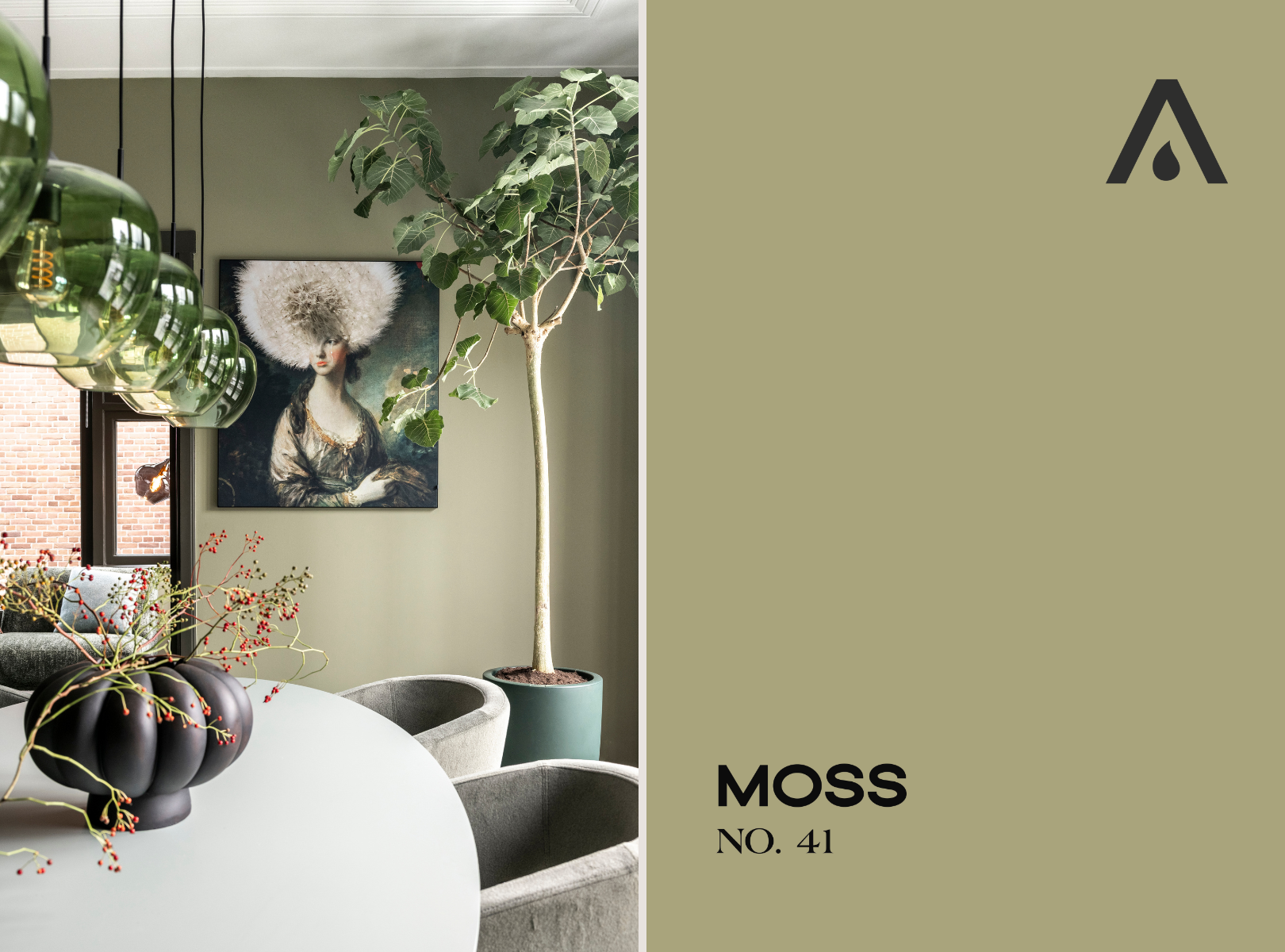 De wanden in de eetkamer en serre krijgen de zachtgroene LAB kleur Moss no. 41. Dit mosgroen creëert direct een oase van rust – precies waar Debbie naar verlangt. Dankzij de subtiele gele ondertoon laat de kleur zich moeiteloos combineren met andere warme kleuren, vooral met geeltinten.