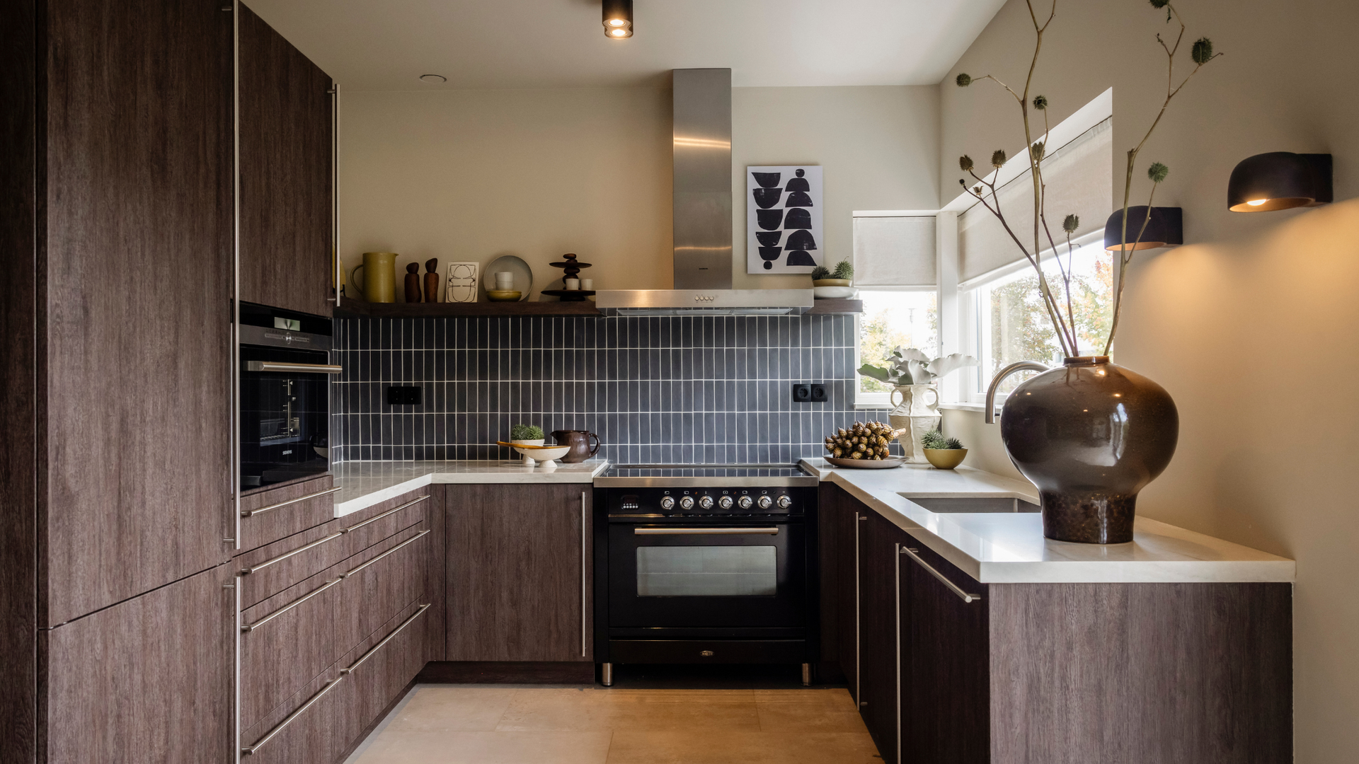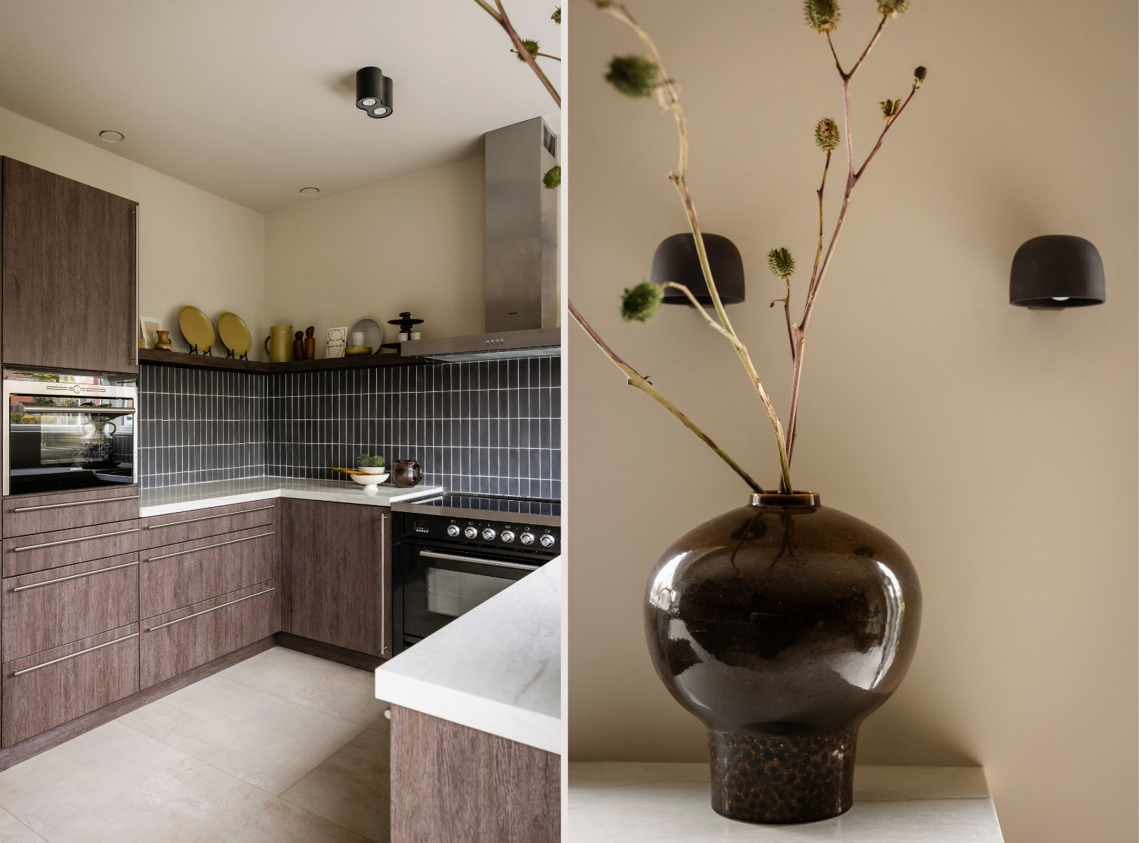 De keuken van Mirthe en Matthijs is functioneel, maar miste warmte en karakter. Ook hier vormt Fluffy Cheetah no. 255 de zachte, warme basis. De tint combineert prachtig met het accent van de donkere tegels. De kasten krijgen een donkere hout-wrap, wat de keuken een rijke, bijna boutique-achtige uitstraling geeft. Zo ontstaat een ruimte die niet alleen praktisch is, maar nu ook naadloos aansluit bij het warme palet van de rest van de woning.