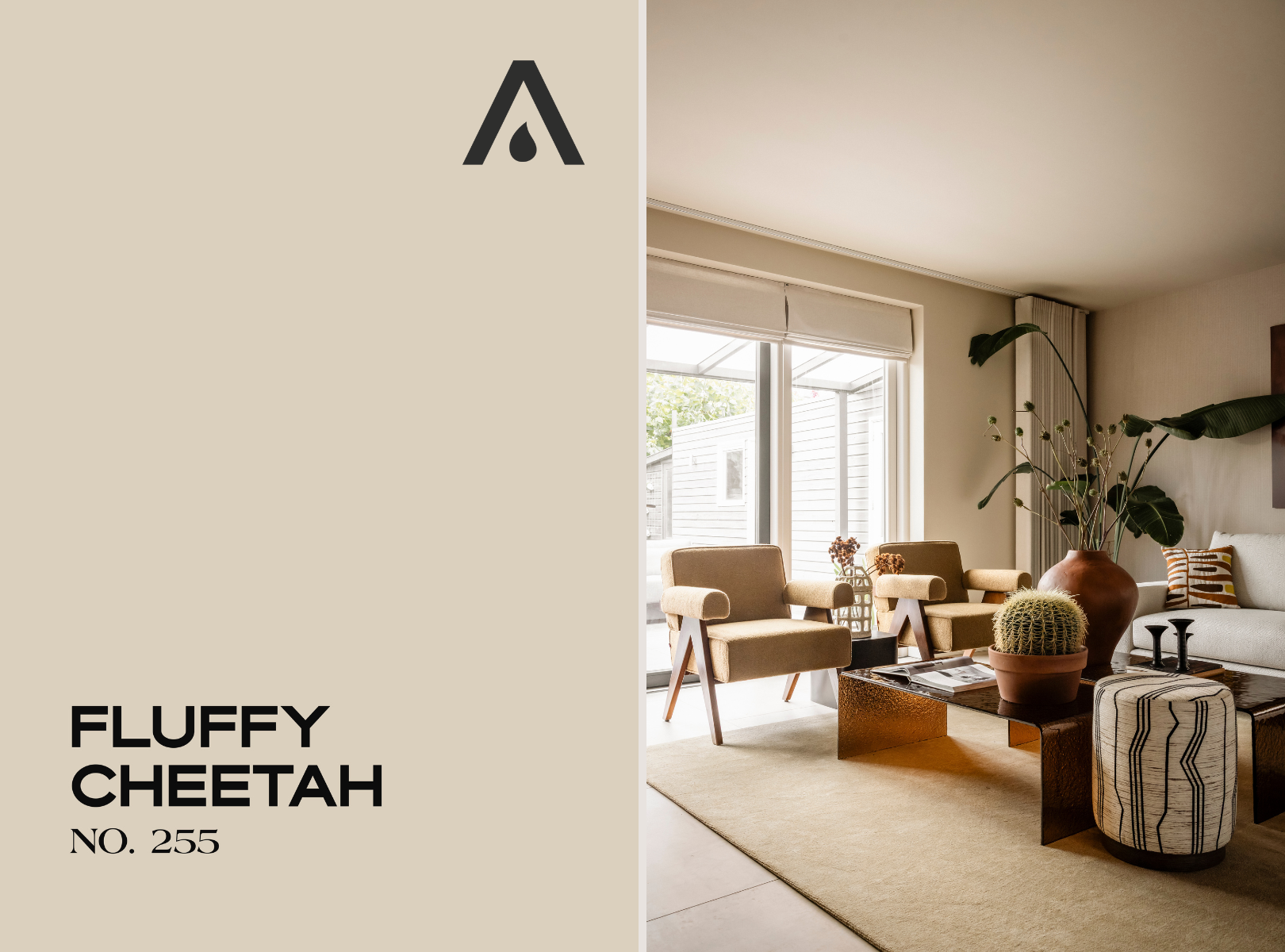 Als basiskleur kiest Liza voor Fluffy Cheetah no. 255 — een zachte, bijna aaibare tint die de hele ruimte direct warmte en rust geeft. Deze neutral verzacht het geheel en brengt een subtiele, zonnige gloed met zich mee; de krachtkleur die de savanne naar binnen haalt en het interieur luxe laat aanvoelen.