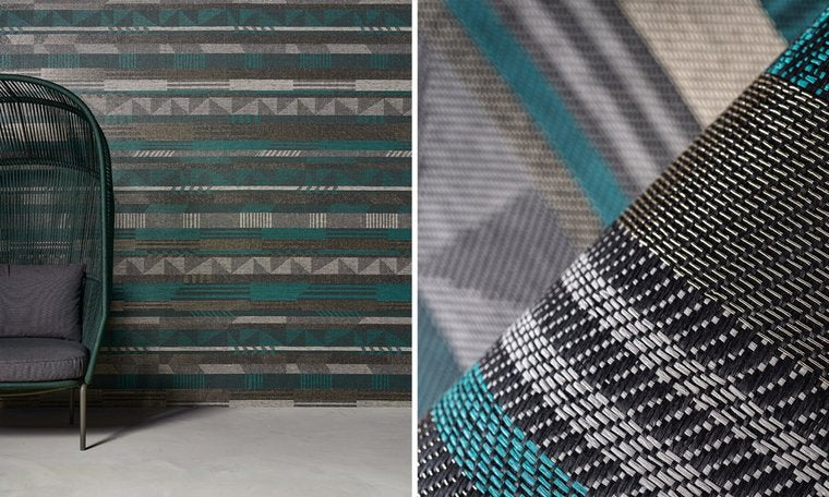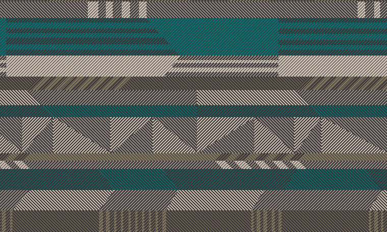 Manovo, the largest national park in Central Africa, is the inspiration for the eclectic mix of botanical prints, geometric shapes and plain patterns. The jacquard technique used weaves different colours of paper together, creating a drawing. In doing so, she creates an abstract, photographic representation of the African savannah. Horizontal and vertical effects alternate, creating tension and relief.
