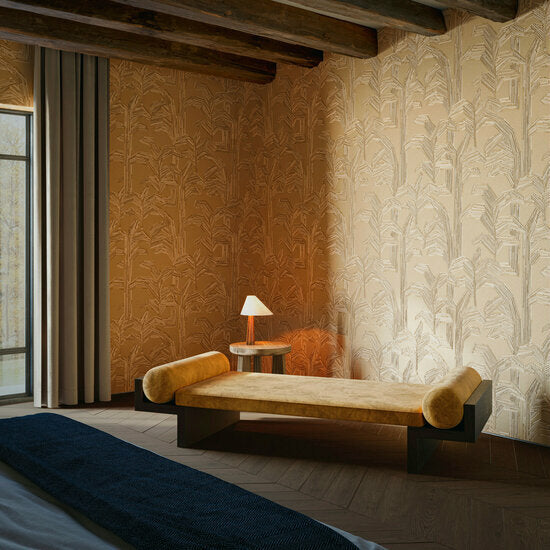Arte Kailua wallpaper is a design that found its name and inspiration in Kailua, a place on the enchanting east coast of Oahu where palm trees are king. For this wallpaper, the waving palms were inlaid with pieces of rattan against a background of bark cloth, a fibrous cloth made from the bark of the fig tree. A very realistic interpretation was made of the whole in vinyl that comes to life beautifully on the wall.