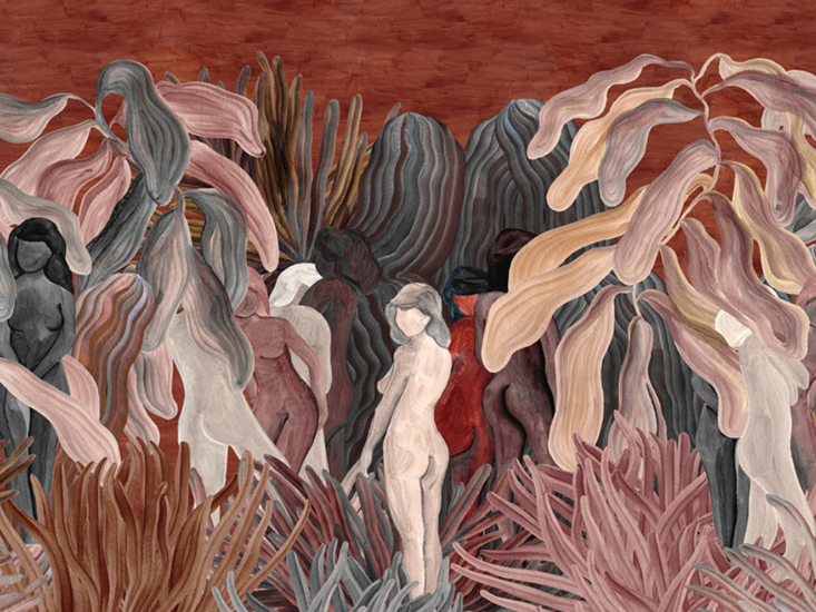ARTE Secret Silhouettes wallpaper is a mysterious panorama of female silhouettes made of soft velvet and takes you into an imaginative story. This dreamy scene with round shapes appeals to the imagination like a painting. The used material of soft velvet fits perfectly with this panorama.
