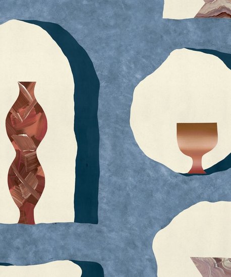 Asteré L'Abri Sous Roche wallpaper 04. The niches not only create the illusion of volume, but also house precious treasures. The different painting styles for the niches and the objects on display make the whole thing even more interesting to look at. The style of this wall covering evokes a Mediterranean atmosphere. This wallpaper is art for the wall.