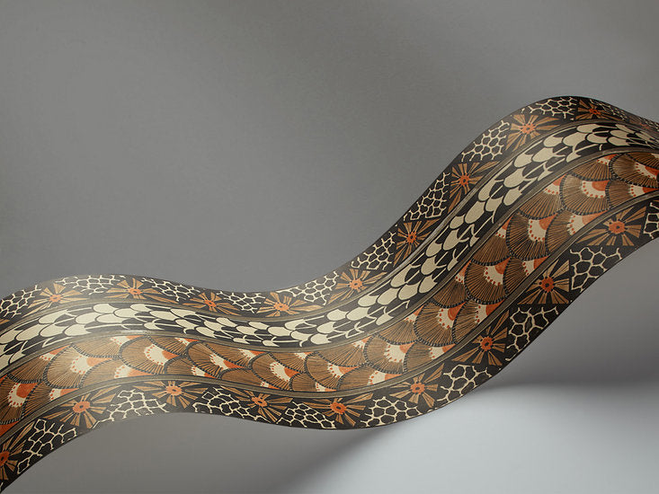 Taken from the decorative detailing on a ceramic vase, this pretty decorative border acts as a decorative edging to many of the papers contained within this collection. Designed to be hung both vertically and horizontally it is offered in three colorings of black and white, soft olive and a dramatic burnt orange and charcoal.