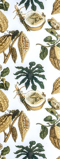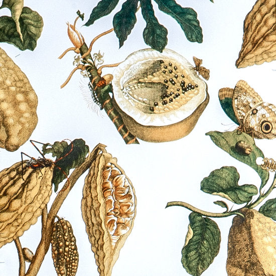 The wallpaper Amazonia resembles in many ways the work of the artist Maria Sibylla Merian (1647 - 1717), who studied the plants and insects and made detailed drawings of them. This wallpaper has branches, fruits, leaves, caterpillars, butterflies and other insects and many other details.