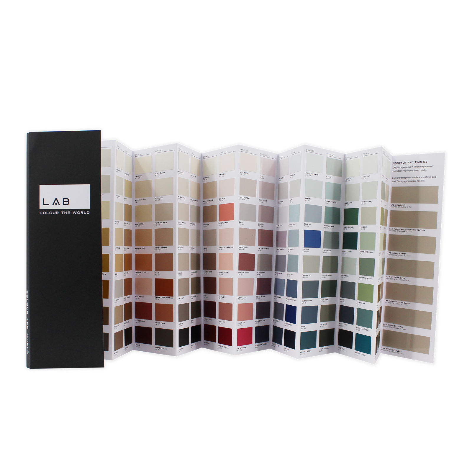 The Colorcard is painted with our own, sustainable lab wallpaint and the color chips contain the characteristic paint stripes. This makes the color exactly match the Lab Wallpaint that you will buy later. For our other products, such as Lab Chalk (lime paint), Lab cementum (concrete look) and Lab Is the paint on the color card a good indication.