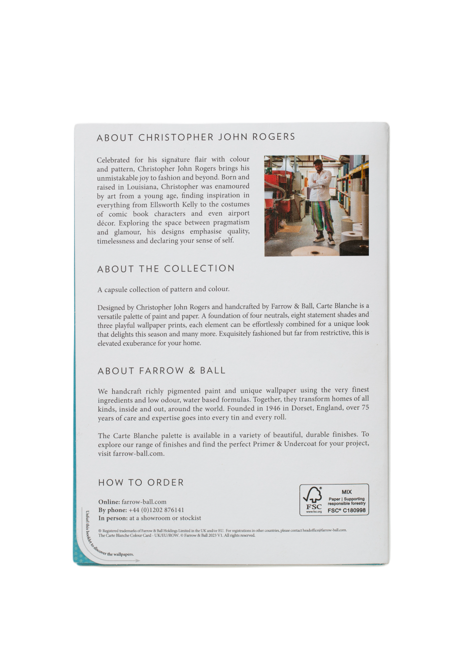 Discover the Carte Blanche collection by Farrow & Ball with the handy A5 colour card. This card provides an overview of all the beautiful colours released in the Carte Blanche collection. In addition to color chips made with real paint, you'll find the intriguing stories behind each color name.