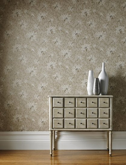 Fairhaven behang 1838 Wallcoverings is voorzien van fijne delicate bloemen en bladeren die elkaar overlappen. Geïnspireerd door Engelse tuinen, dit behang geeft een rustgevende en ontspannen sfeer aan uw interieur. De mooie wervelende bloemen zorgen voor een betoverende achtergrond en geeft direct stijl aan uw kamer. De bladeren zijn omlijnd met een metallic tint om extra contrast toe te voegen.