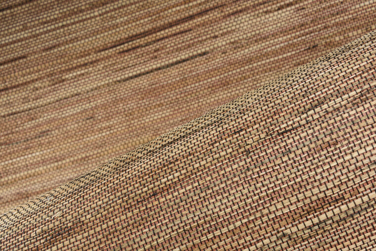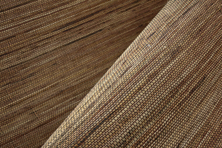 Dit dessin is gemaakt van hennepvezels waarvan de natuurlijke kleuren contrasteren met de zwarte, fijne garens die de vezels aan elkaar rijgen. De onregelmatige draden van verschillende diktes en knoopjes zijn duidelijk zichtbaar en maken Sambe authentiek en puur.
