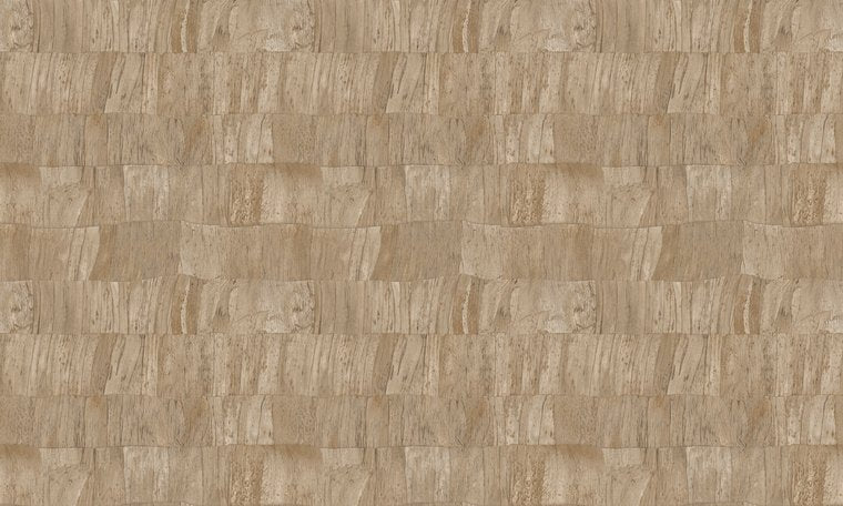 De overlappende bananenbladeren creëren een rustig geheel doordat de stroken onherkenbaar zijn. Deze faux-uni charmeert door de dakpansgewijze compositie en het zachte, uitgesproken reliëf.
