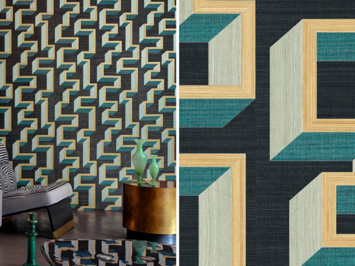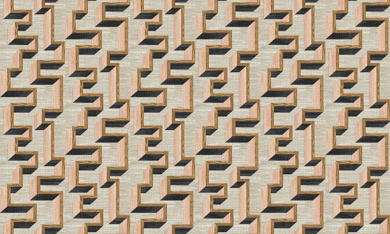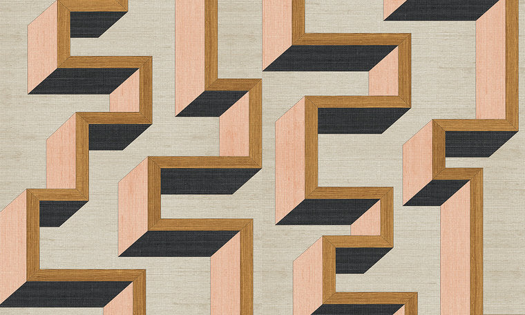 Detour is een speels, geometrisch dessin. Het doolhofpatroon en de dubbele richting van het sisalweefsel creëren een 3D-effect. De drie gebruikte kleuren versterken dit resultaat.