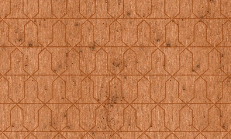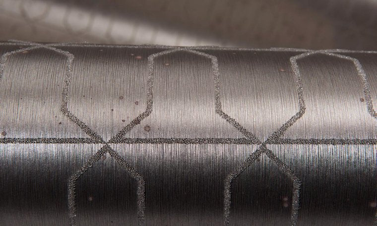 Het repetitieve patroon van Domus is onder meer gedrukt in satijnlak. Die afwerking geeft het geheel een schitterende glans en creëert bovendien de subtiele illusie van reliëf.