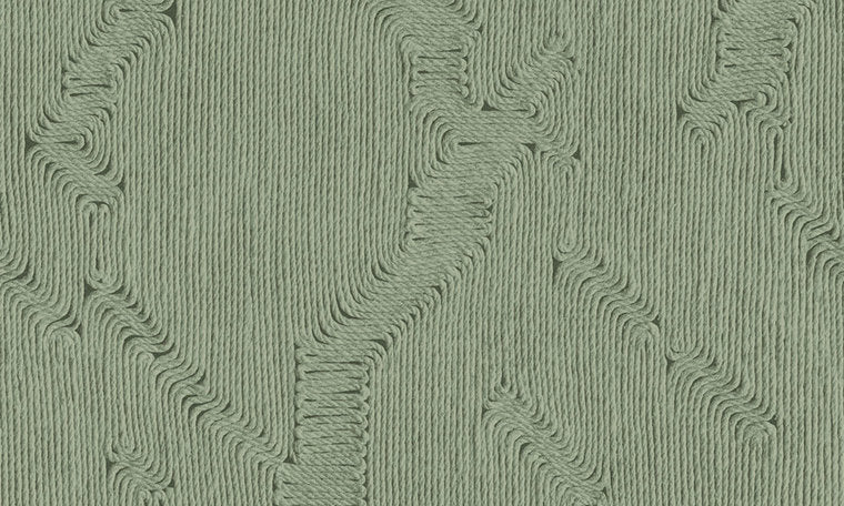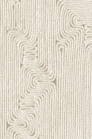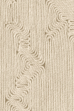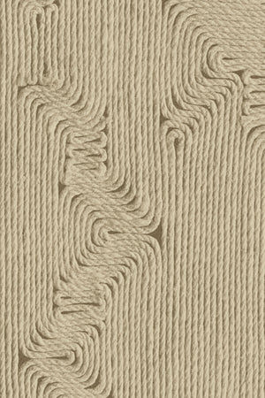 Behang met florale tekeningen in combinatie met organische vormen. Handmatig plaatst men minutieus touw van verschillende materialen en diktes in patronen waardoor een minimalistische tekening met bijhorend reliëf ontstaat.