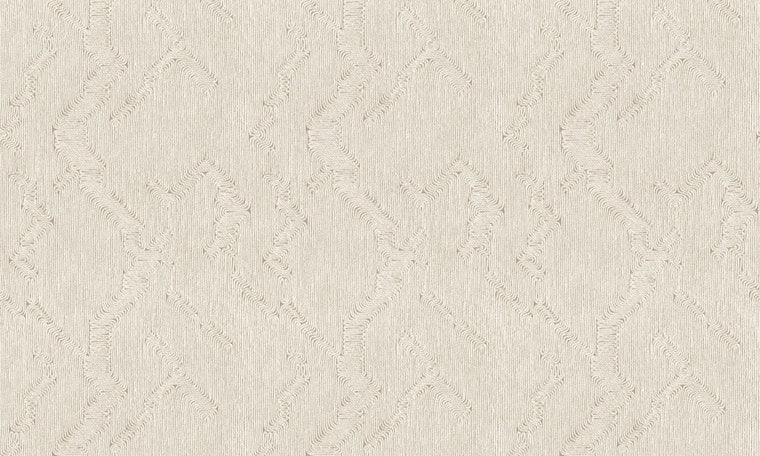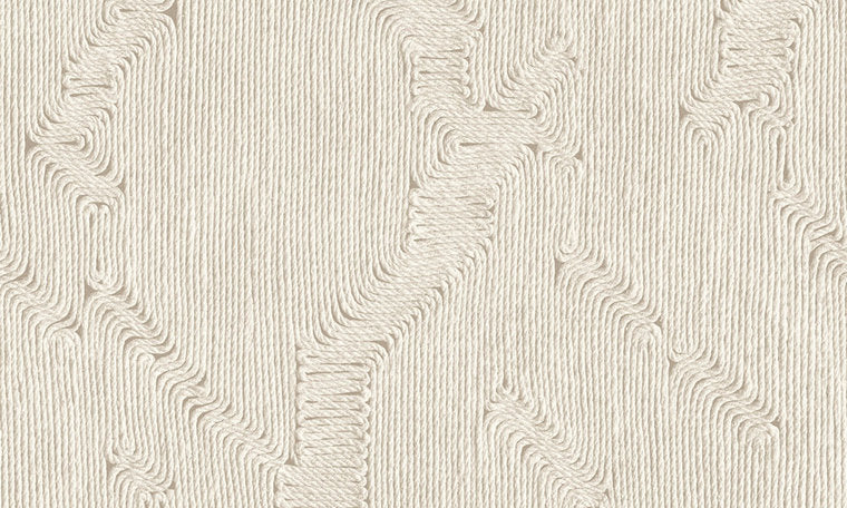 Behang met florale tekeningen in combinatie met organische vormen. Handmatig plaatst men minutieus touw van verschillende materialen en diktes in patronen waardoor een minimalistische tekening met bijhorend reliëf ontstaat.