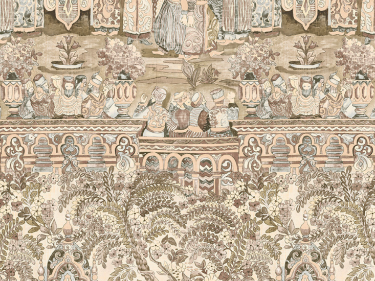 Dit kleurrijk patroon gebaseerd op een handschilderij illustreert een vrolijk tafereel uit het Ottomaanse rijk. Er valt eindeloos veel te ontdekken. De muurbekleding imiteert erg fijne zijde. Een waar statement piece!